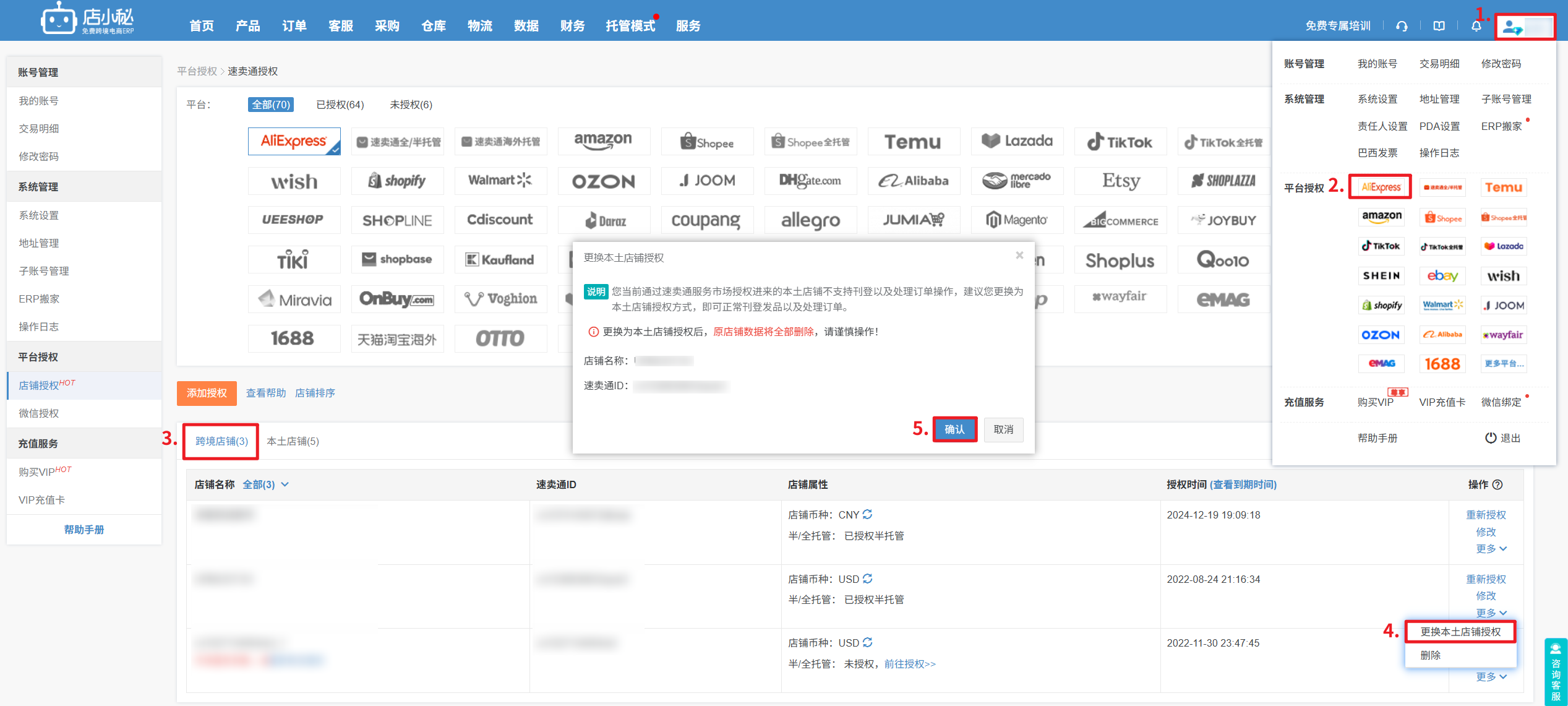 第一步:【登录店小秘主账号—用户名—平台授权—点击“AliExpress”—选择跨境店铺—找到对应店铺—更多—更换本土店铺授权—点击确认】
