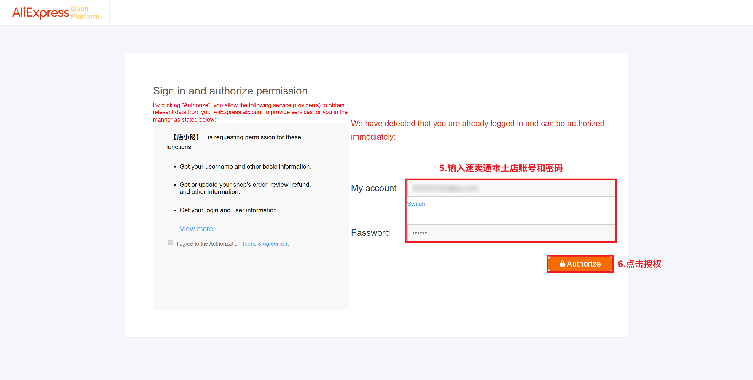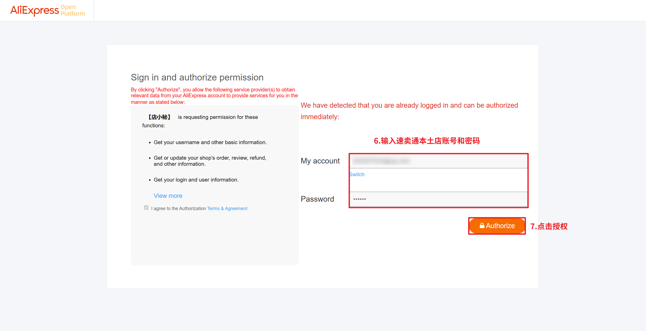 第二步:【跳转至速卖通登录界面—输入速卖通本土店账号和密码—点击授权即可】