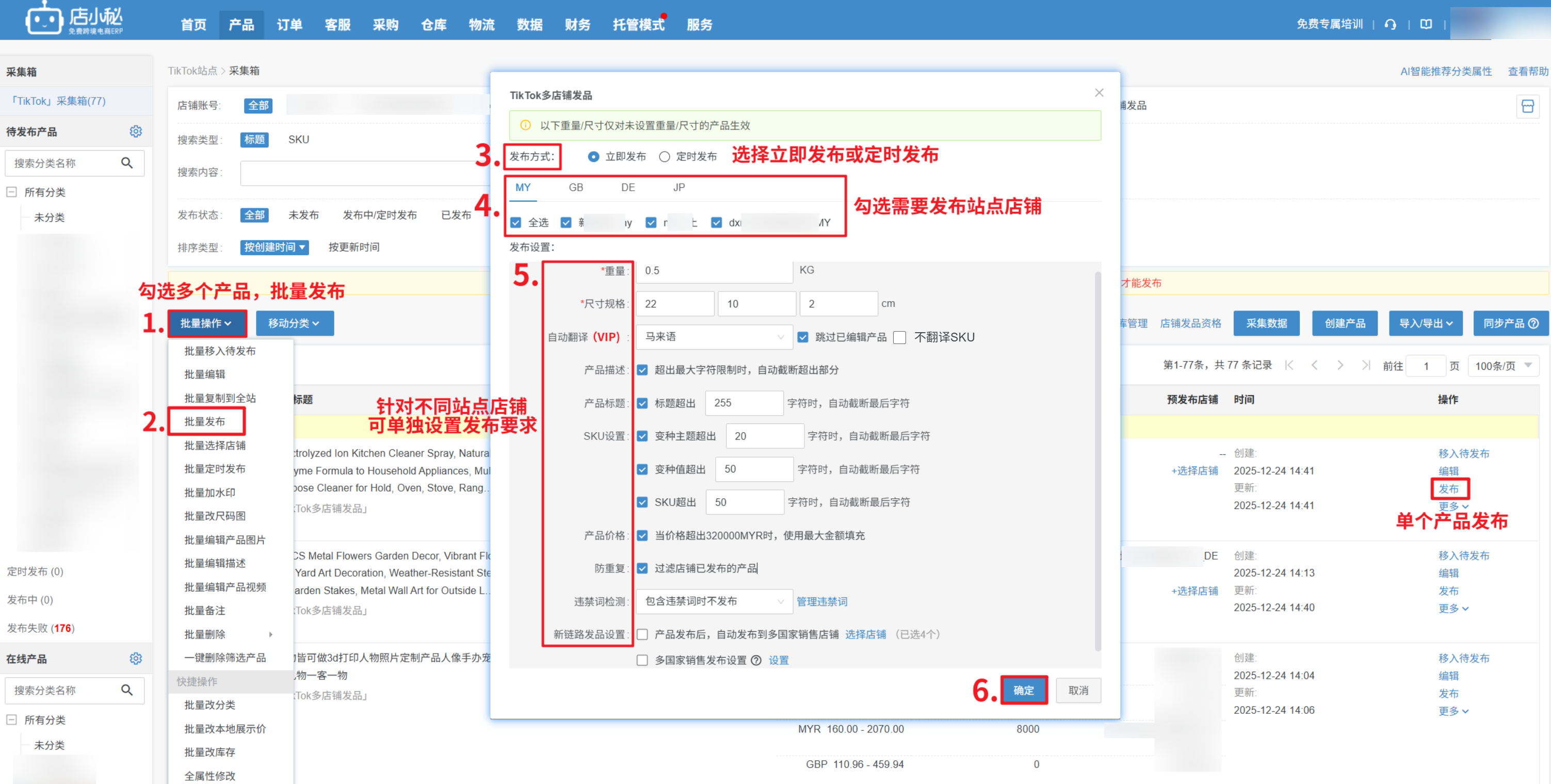 第二步:【产品—TikTok站点产品—采集箱—单个/批量选择预发布店铺—勾选店铺—点击确定—单个/批量编辑产品信息】