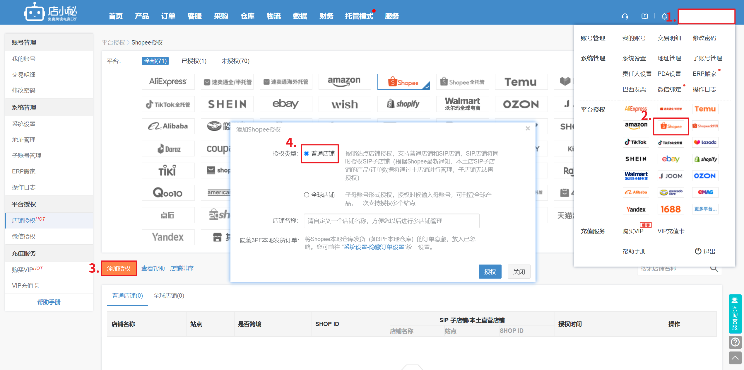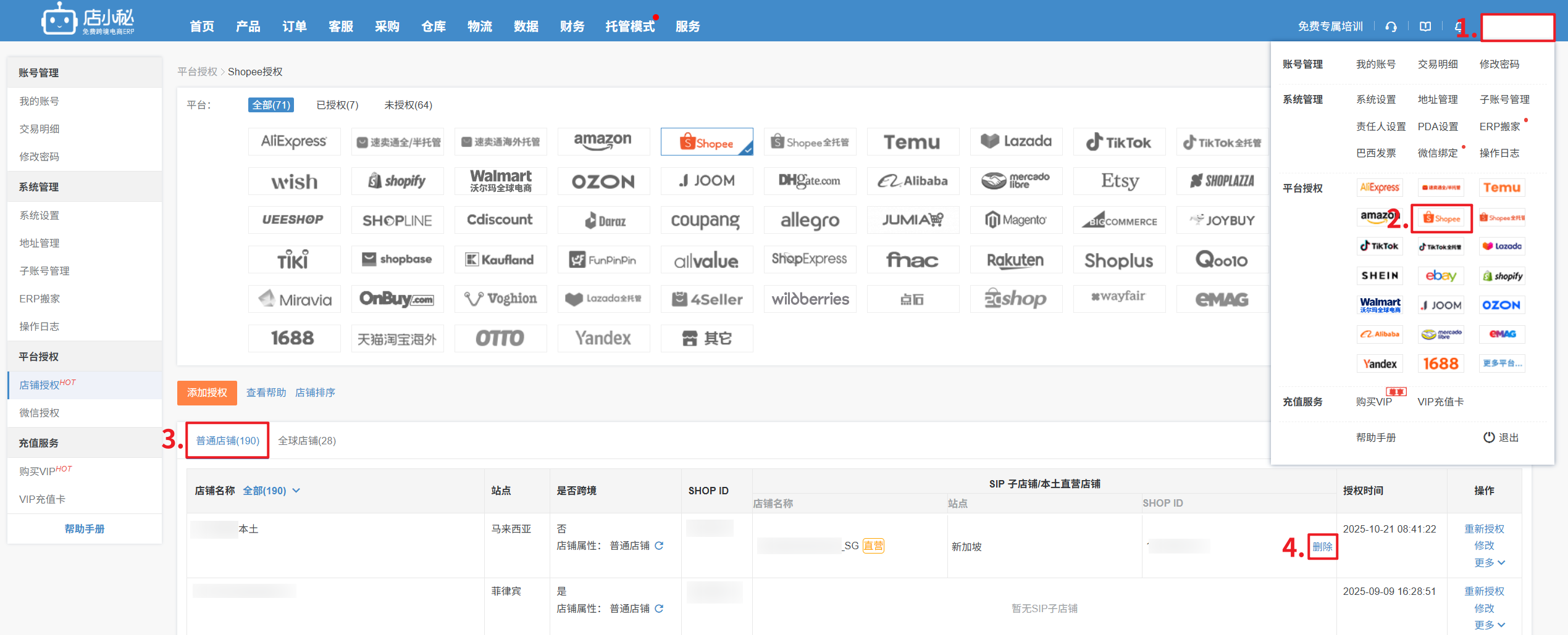 注意:删除店铺授权,订单等数据信息会彻底删除,且无法恢复,具体可参考:删除店铺注意事项