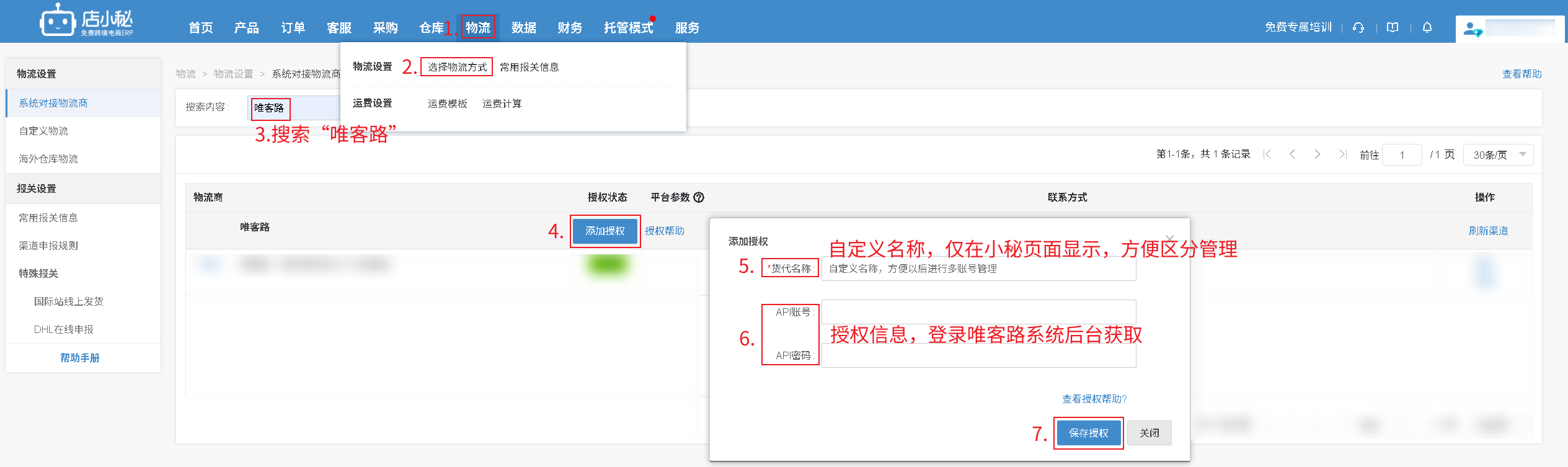 第一步:【物流—选择物流方式—搜索“唯客路”—添加授权—自定义物流商名称—授权信息登录唯客路后台获取—保存授权】