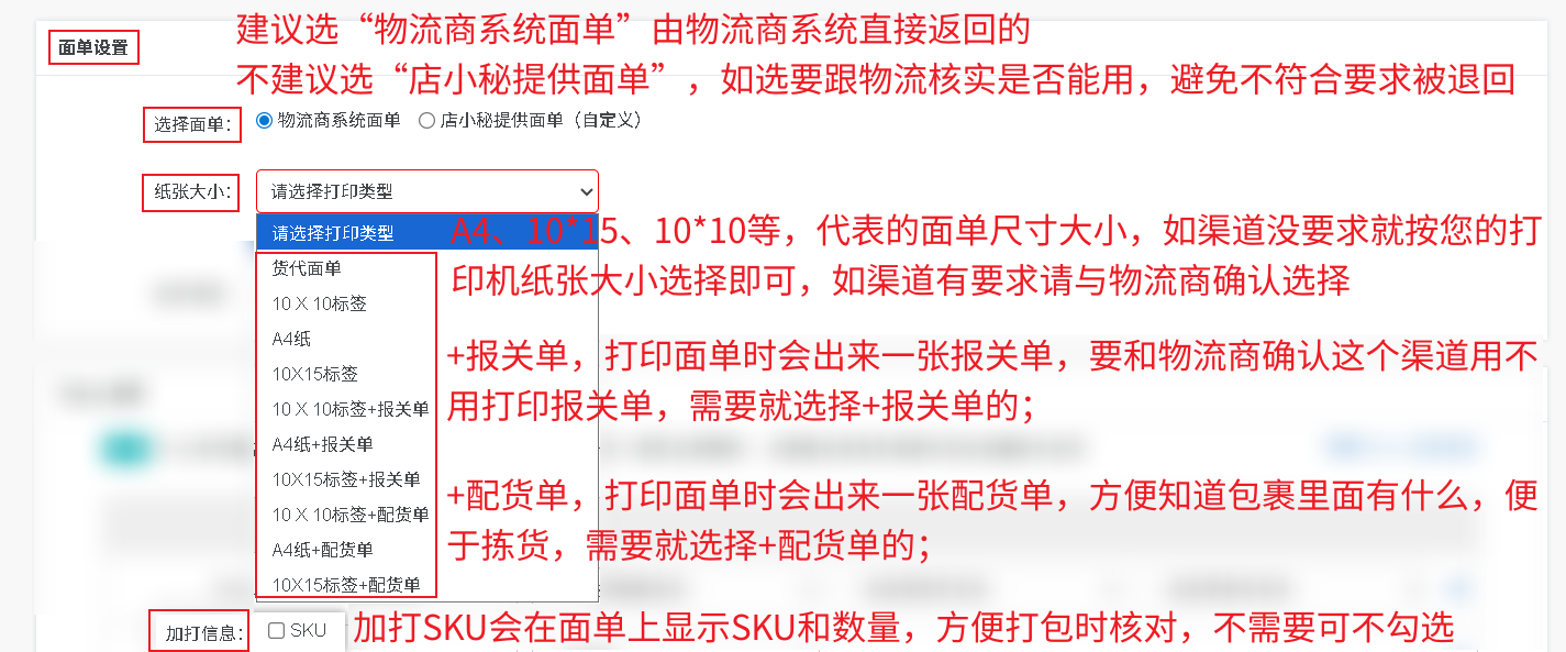 选择面单:请选“物流商系统面单”,由物流商系统直接返回的,不建议选“店小秘提供面单”,如选要跟物流核实是否能用,避免