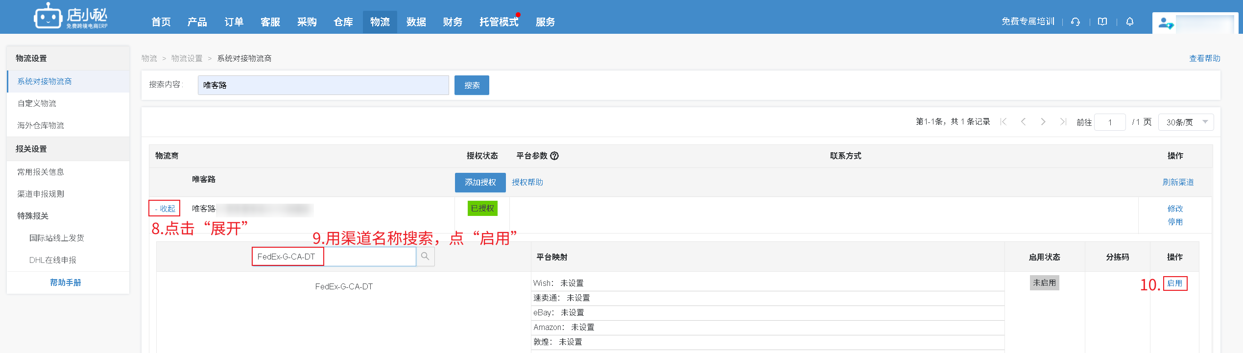 第一步完成授权后,仅代表店小秘和物流的授权打通了,接下来要告诉物流商你的订单走哪个渠道,物流商下面有很多渠道,