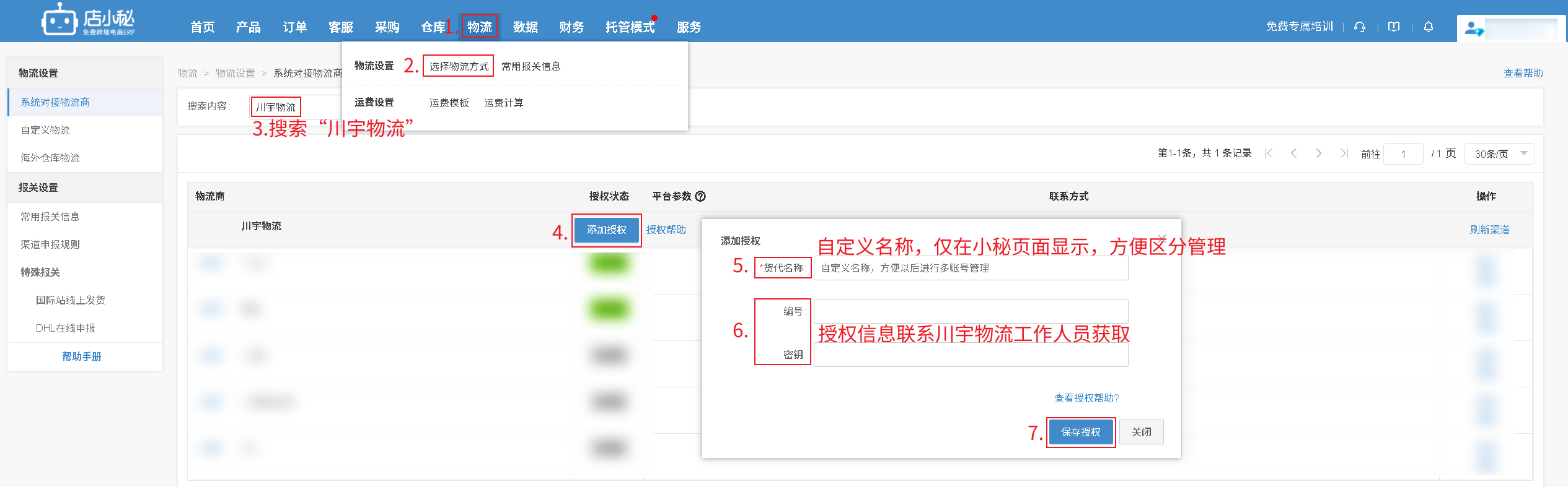 第一步:【物流—选择物流方式—搜索“川宇物流”—添加授权—自定义物流商名称—授权信息联系川宇物流工作人员获取—保存授权】