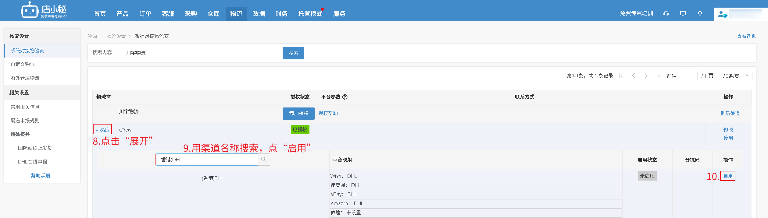 第一步完成授权后,仅代表店小秘和物流的授权打通了,接下来要告诉物流商你的订单走哪个渠道,物流商下面有很多渠道,