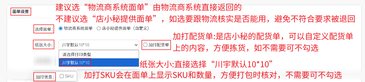 选择面单:请选“物流商系统面单”,由物流商系统直接返回的,不建议选“店小秘提供面单”,如选要跟物流核实是否能用,避免