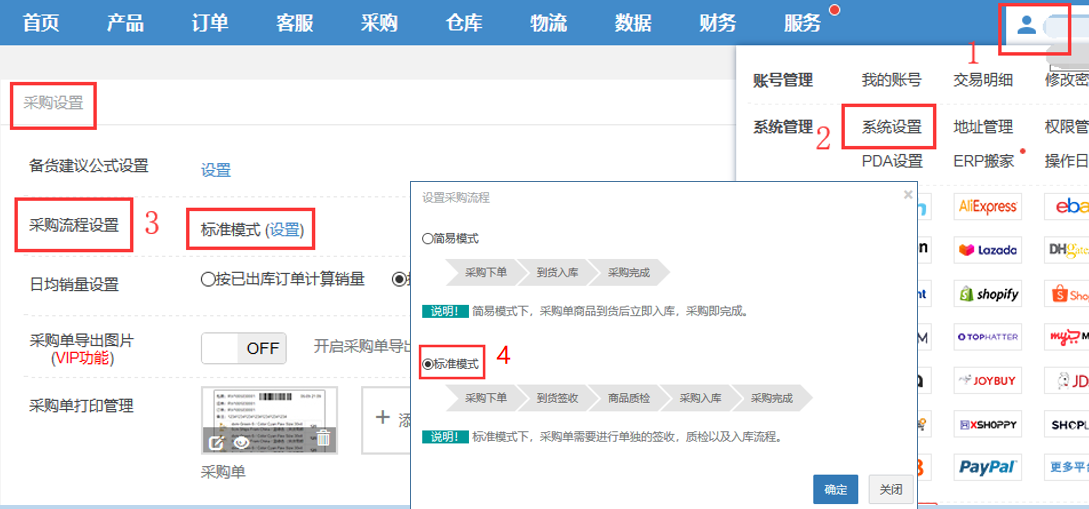 【主账号—用户名—系统设置—采购流程设置—点击设置—选择简易模式—确定】