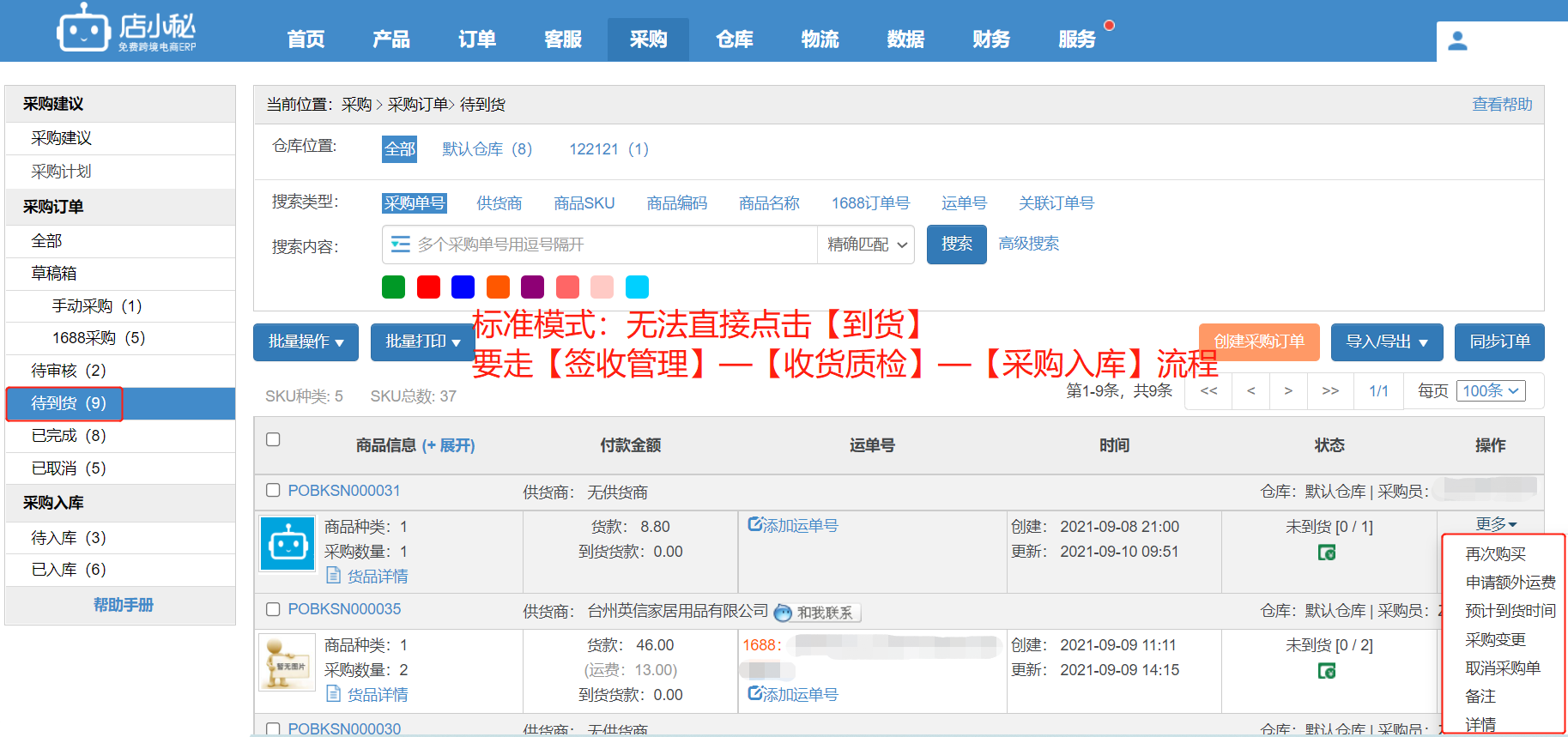解决方案一:如果不需要进行质检流程,可切换回简易模式,直接点击到货,输入数量,完成收货