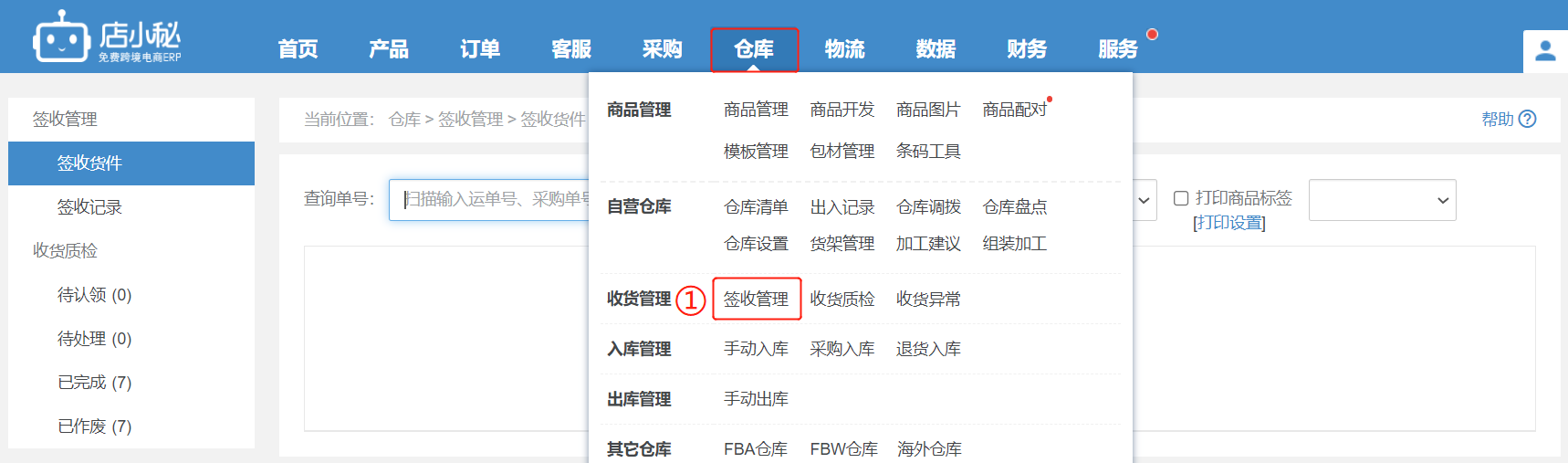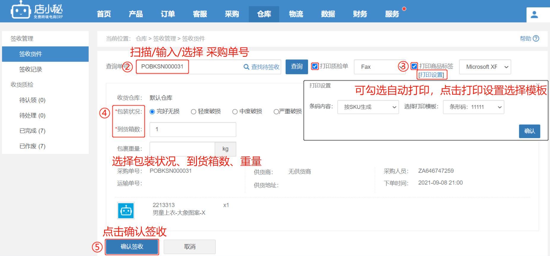 第一步:【仓库—签收管理—输入/查找选择采购单—可勾选打印质检单/商品标签—选择包装状态、箱子数,确认签收】