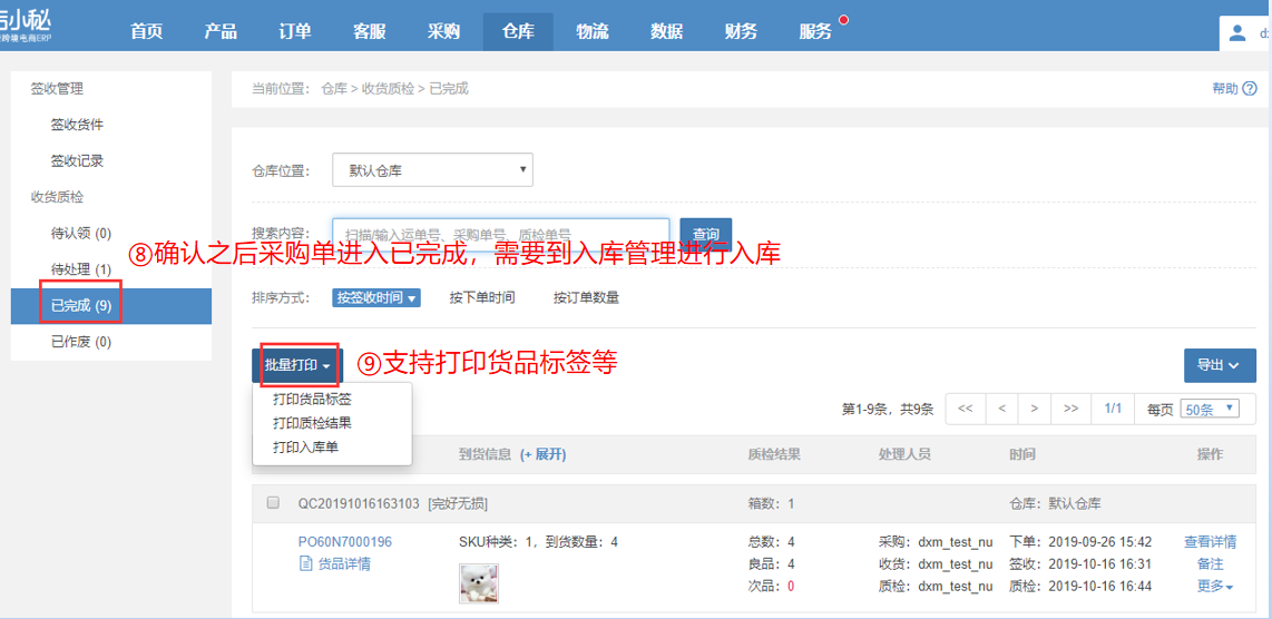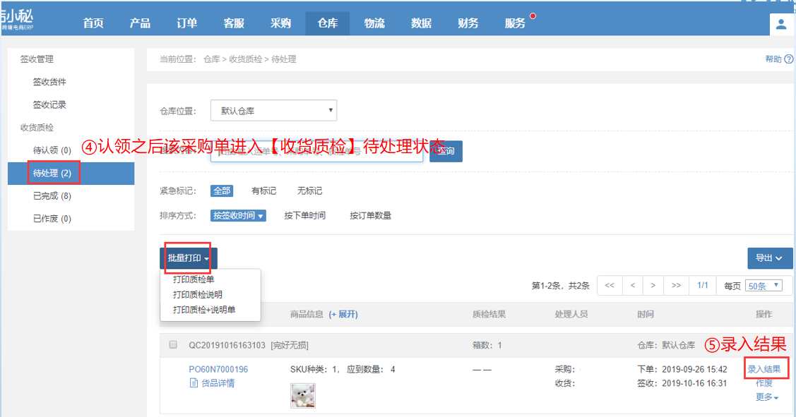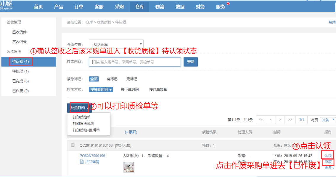 第二步:【仓库—收货质检—待认领—认领—货件进入待处理—可打印质检说明—按质检说明对货件进行质检—录入结果,