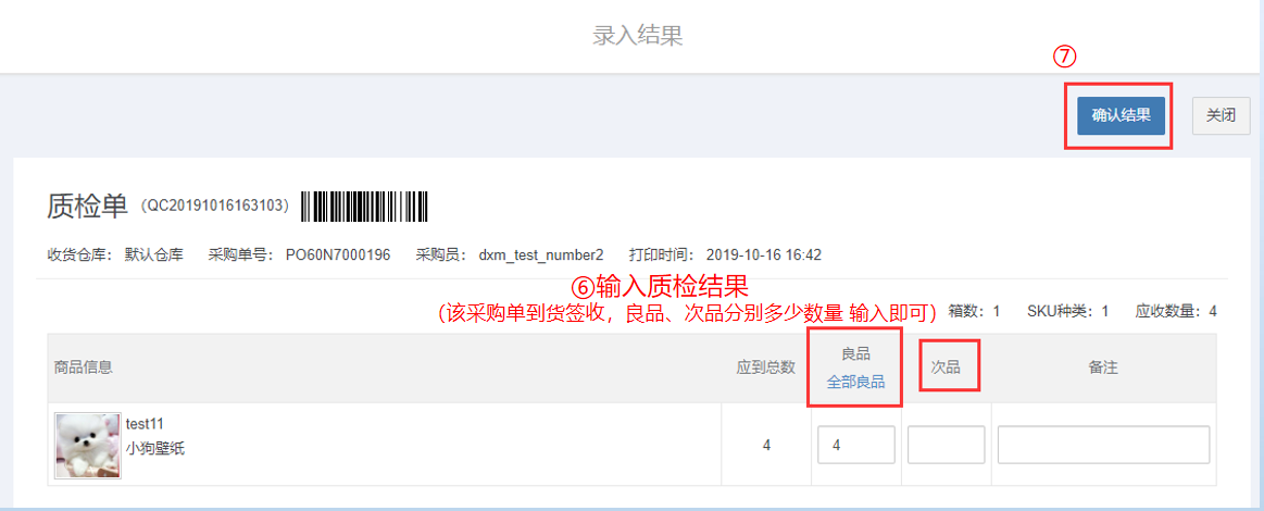 录入良品/次品数—确认结果—货件进入已完成】