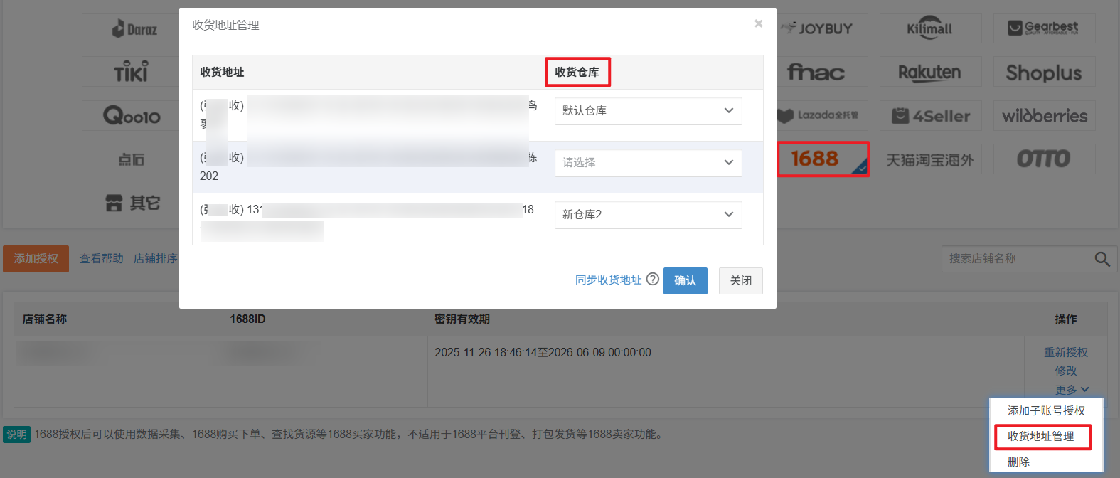 【3】一个1688账号一个收货地址只能关联一个仓库,不同的1688账号可以重复关联一个仓库