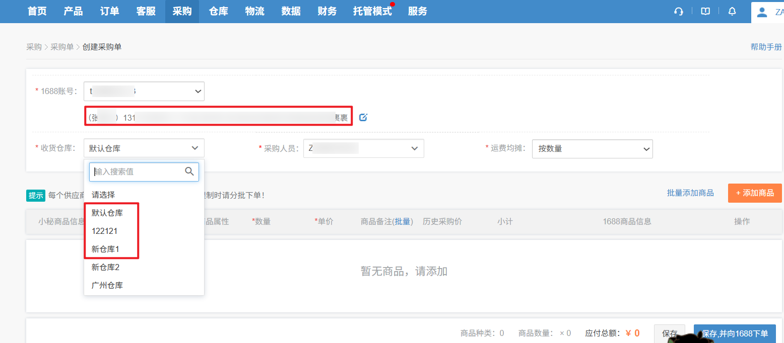 【5】创建1688采购单时,选择了账号和仓库,若当前仓库和当前所选的账号中收货地址关联,使用关联地址,