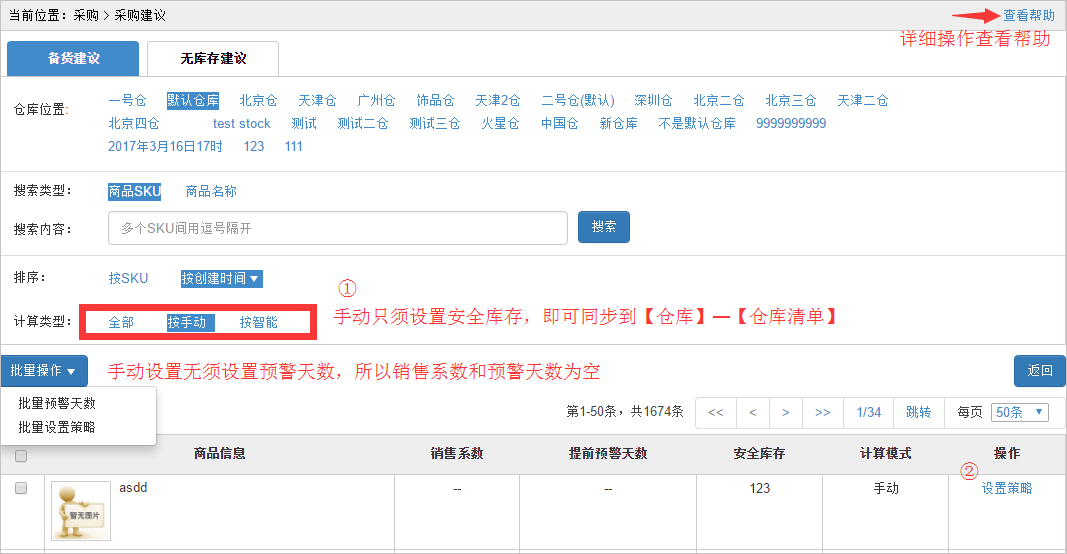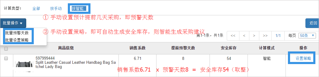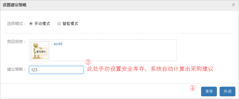 按手动:只需要设置安全库存数量,系统自动计算出采购建议【按智能】:
