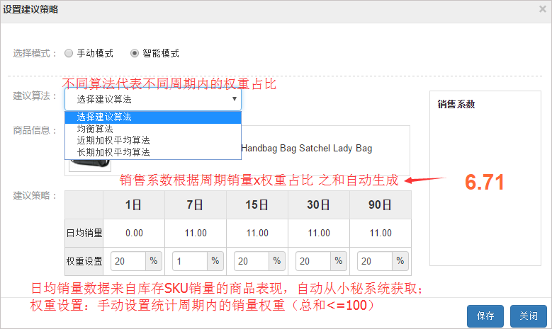 建议算法:均衡算法:不同日期日均销量权重等比。近期加权算法:1日日均销量权重比最大,次之7日,90日权重最小。长期加权算法:和近期相反,1日销量权重最小,90日最高。