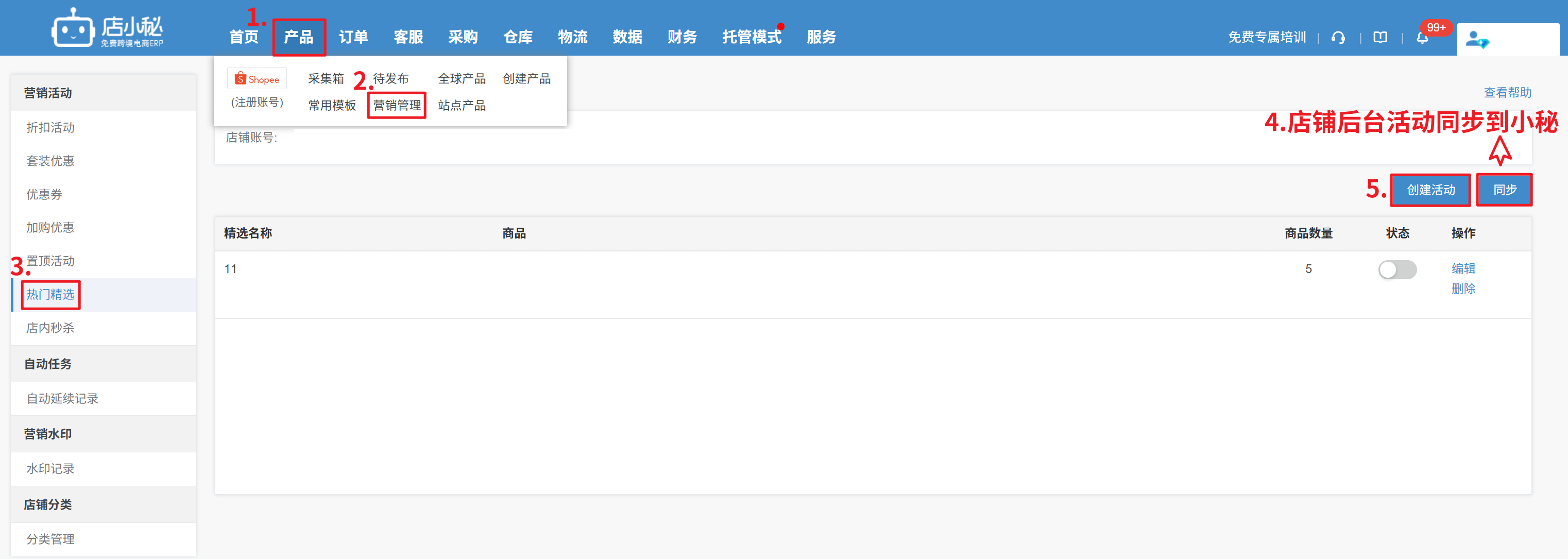 【1】活动不会自动同步 只有手动同步,店铺后台没有开启的活动也可以同步过来