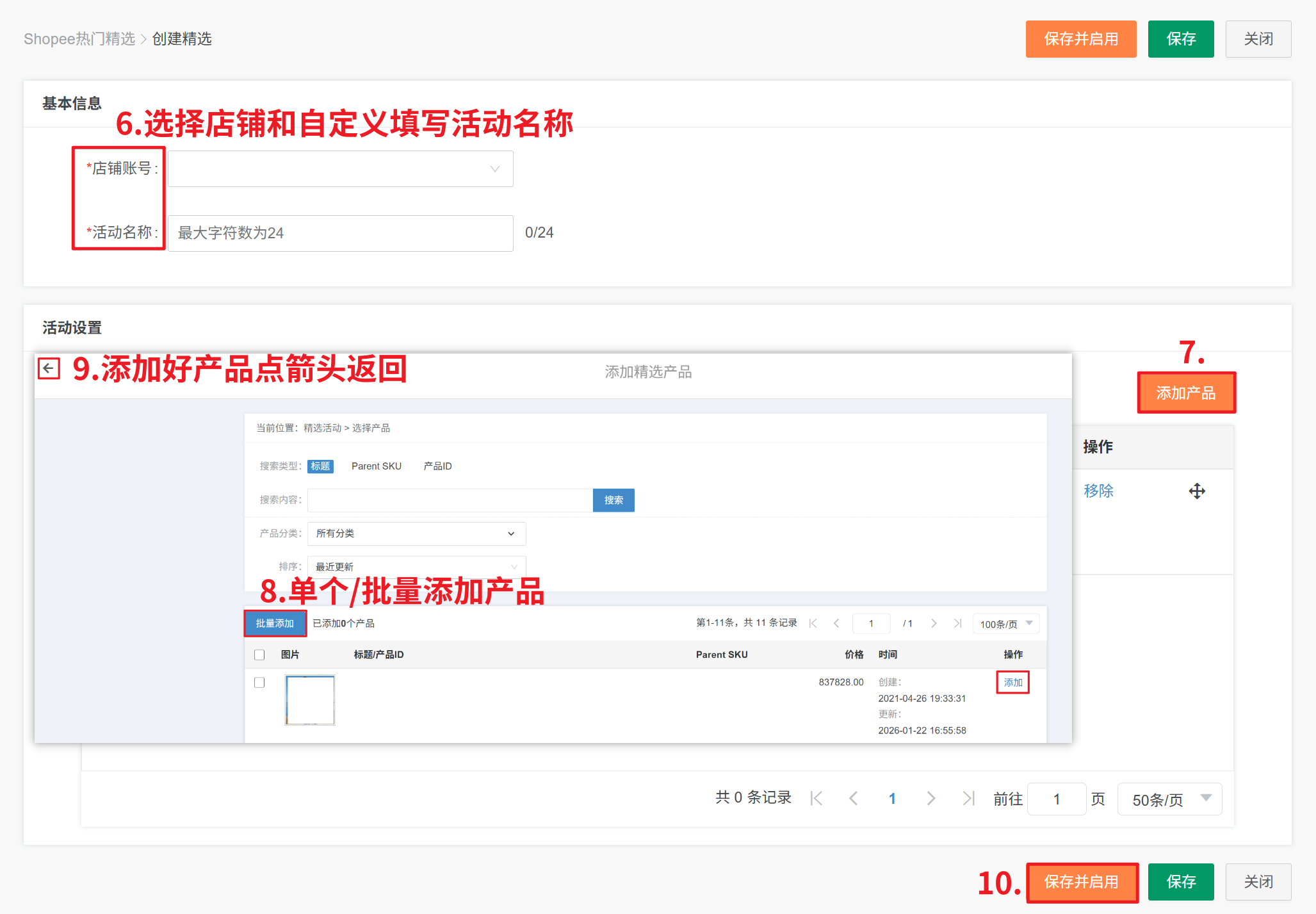 第二步:【选择店铺、填写活动名称—添加产品—选择具体产品—添加—返回—保存并启用】