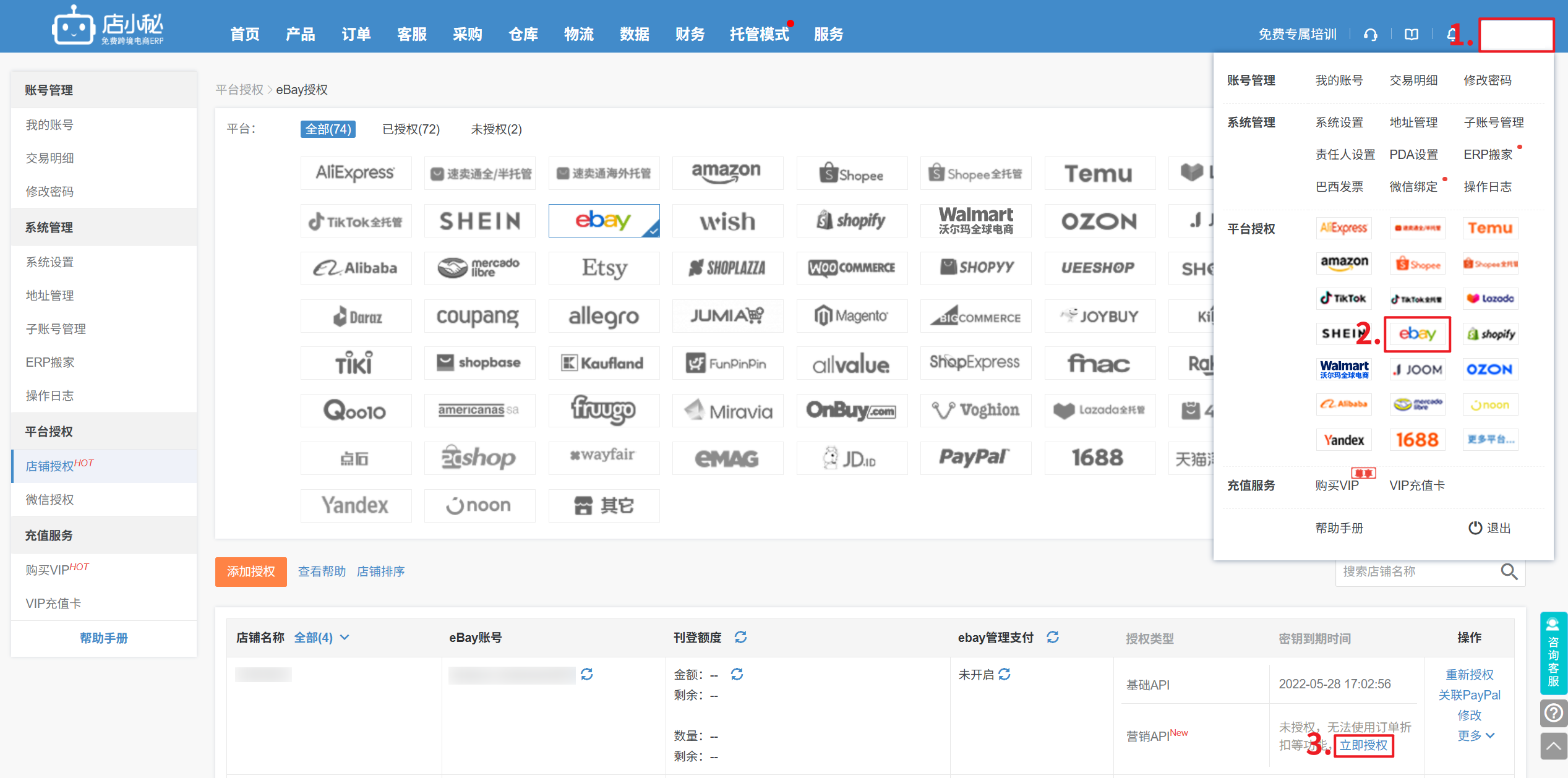 第一步:【登录店小秘主账号—用户名—平台授权—重新授权—营销API—跳转登录eBay账号,完成授权】