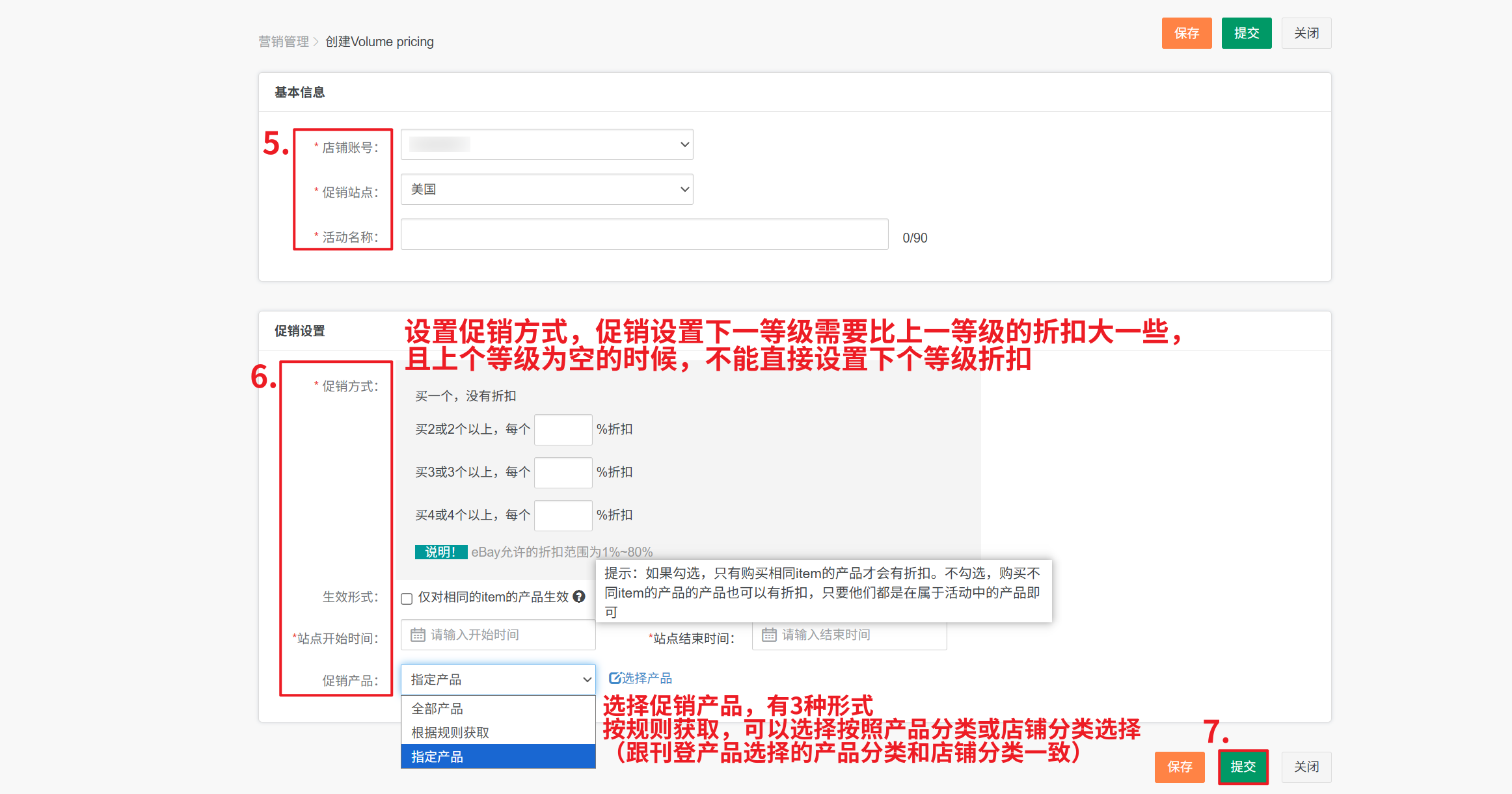 第三步:【选择店铺、站点—自定义活动名称—选择促销方式,设置折扣率—选择生效形式、开始时间