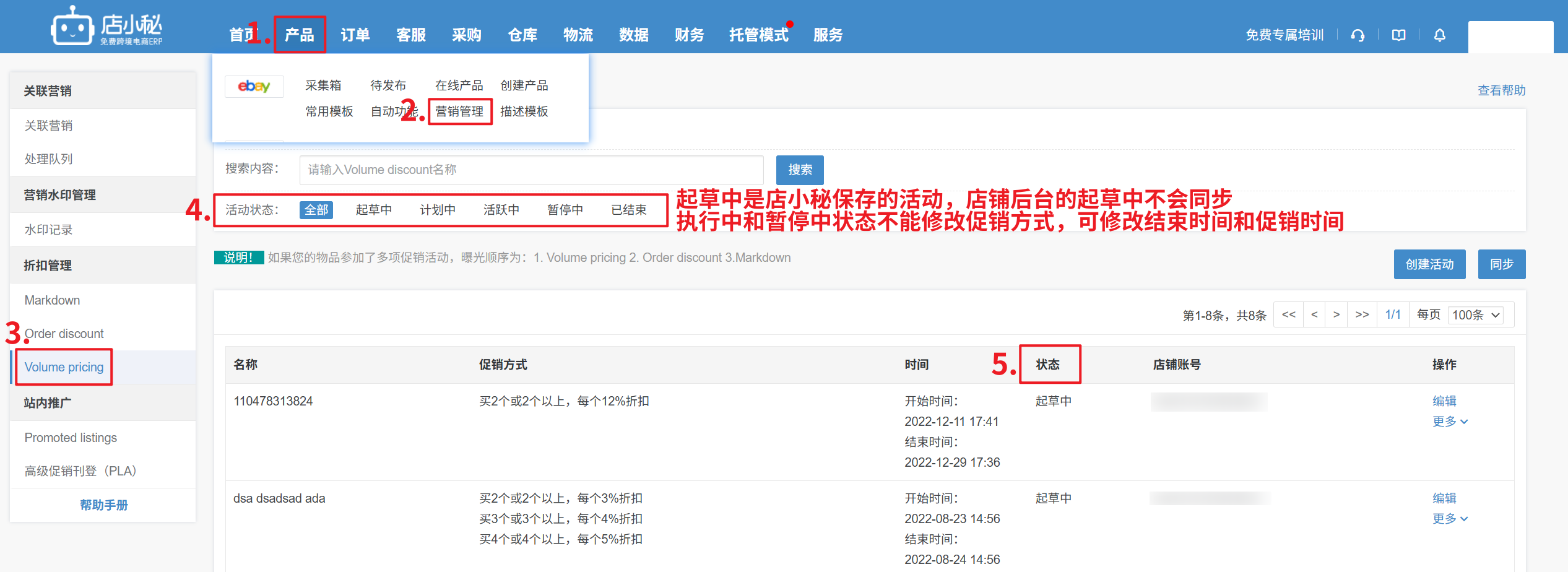 【4】起草中是店小秘保存的活动,店铺后台的起草中不会同步