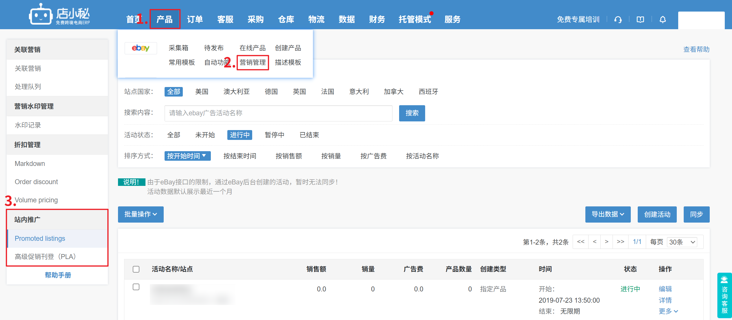 ③ eBay后台更新的活动,需要在店小秘手动更新,目前可以同步后台计划中、活跃中、暂停中、已结束的状态