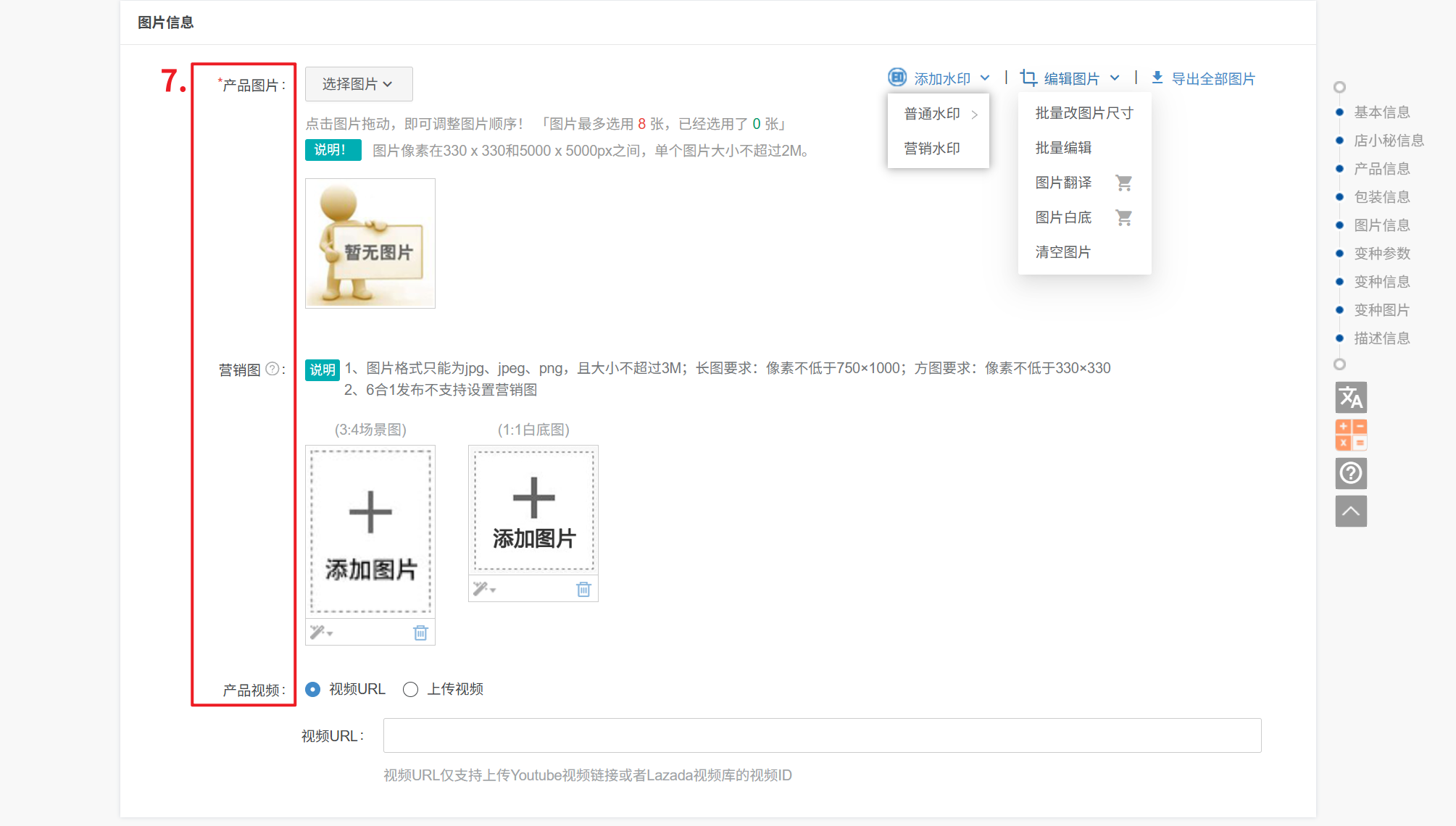 ③ 产品视频:站点发布支持本地上传+Lazada视频库+视频URL,三种方式上传