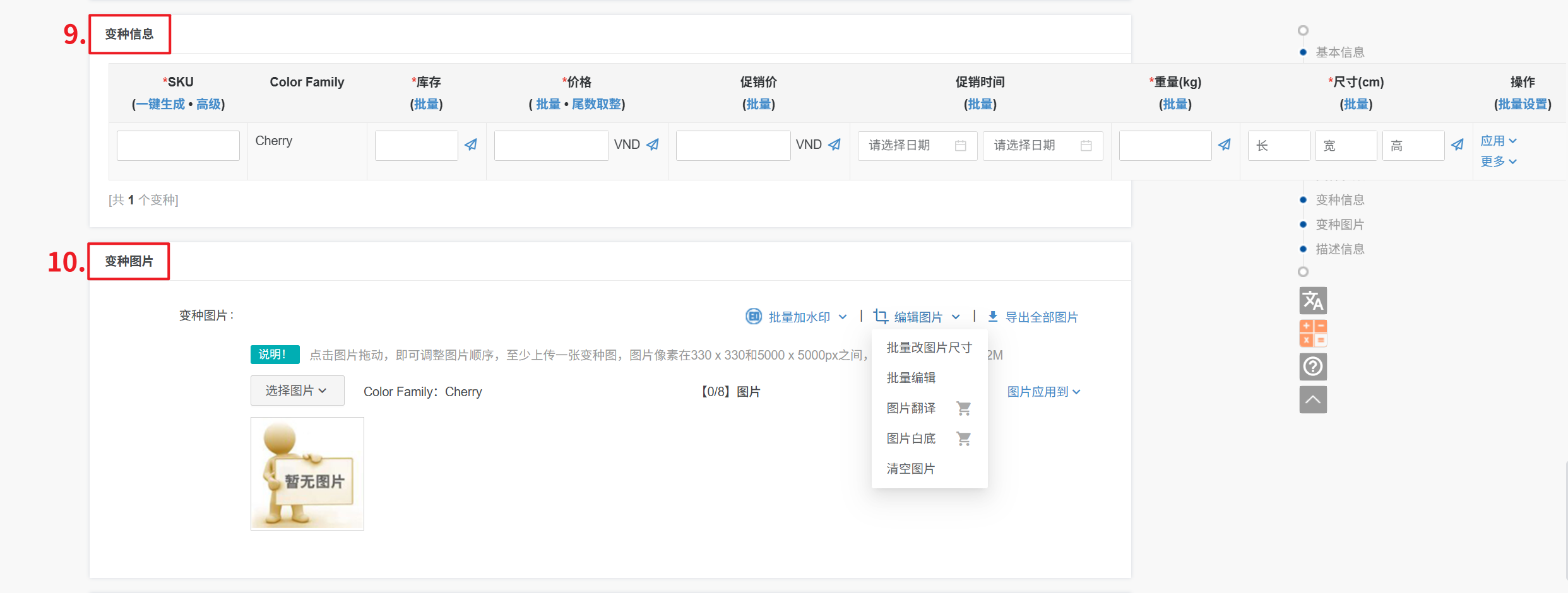 10、变种图片:1、至少上传一张变种图,最多8张,图片像素在330 x 330和5000 x 5000px之间,单个图片大小不超过2M