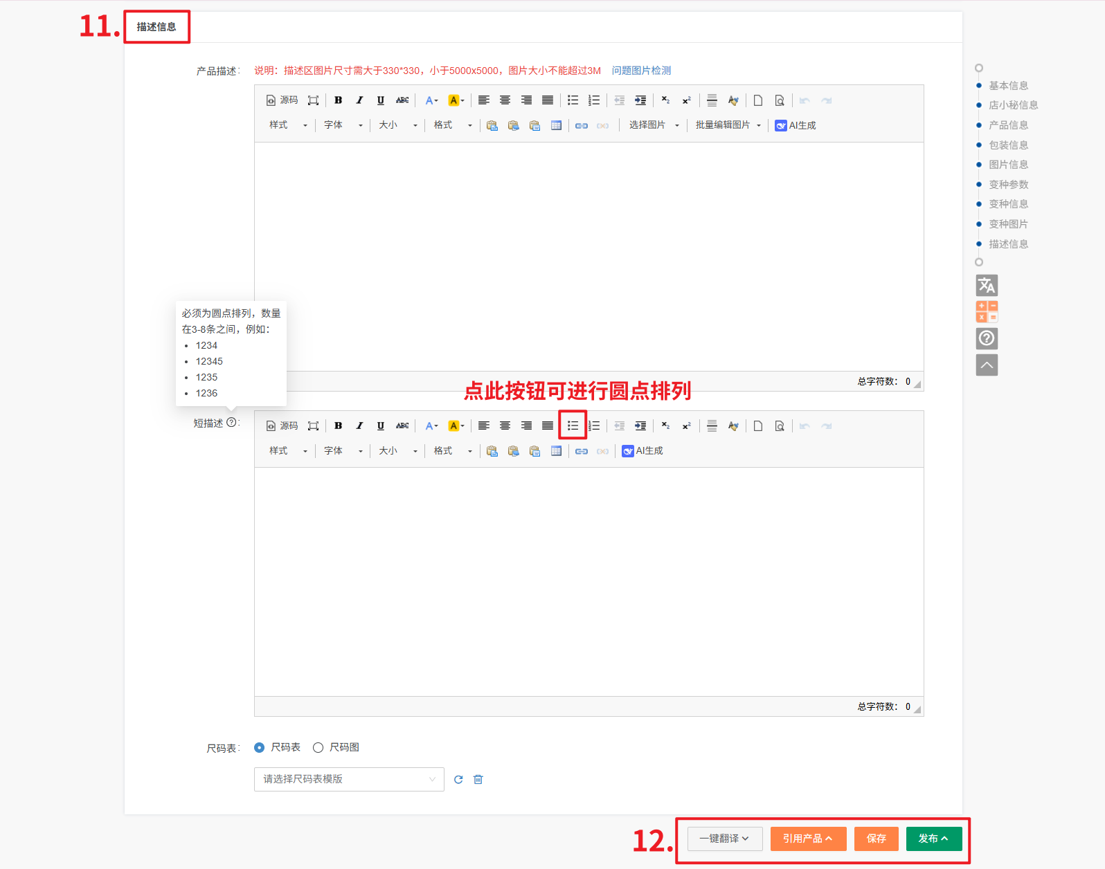 ② 短描述:可填写产品的主要特征和卖点,数量在3-8条之间,填写完成选中内容加上圆点排列