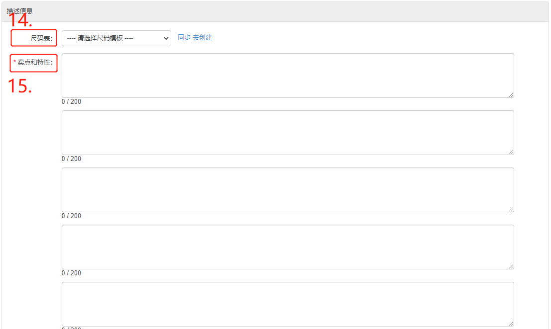 14、尺码表:该尺码模板在敦煌店铺后台创建,然后可点击同步再下拉选择