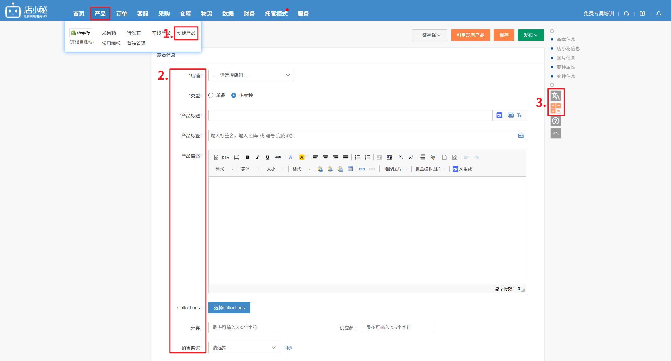 ① 数据采集: 将其它电商平台站点的产品信息一键采集到店小秘