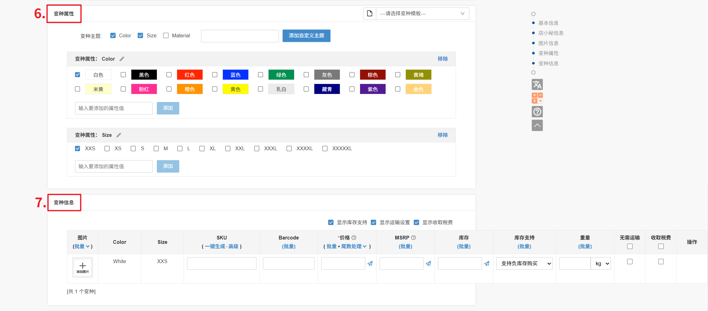 变种主题、变种属性:产品以什么维度区分变种的,例如颜色、尺寸等属于变种主题,选择变种主题后,在勾选对应的变种属性值