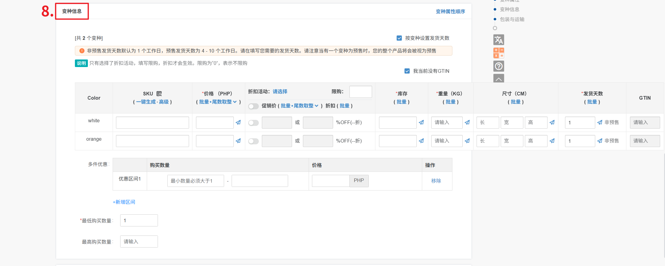 11、填写包装重量尺寸信息、选择产品是否预购