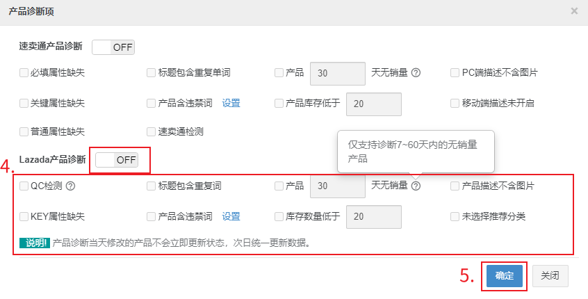 第一步:【用户名—系统设置—产品诊断—设置诊断项—开启Lazada产品诊断】