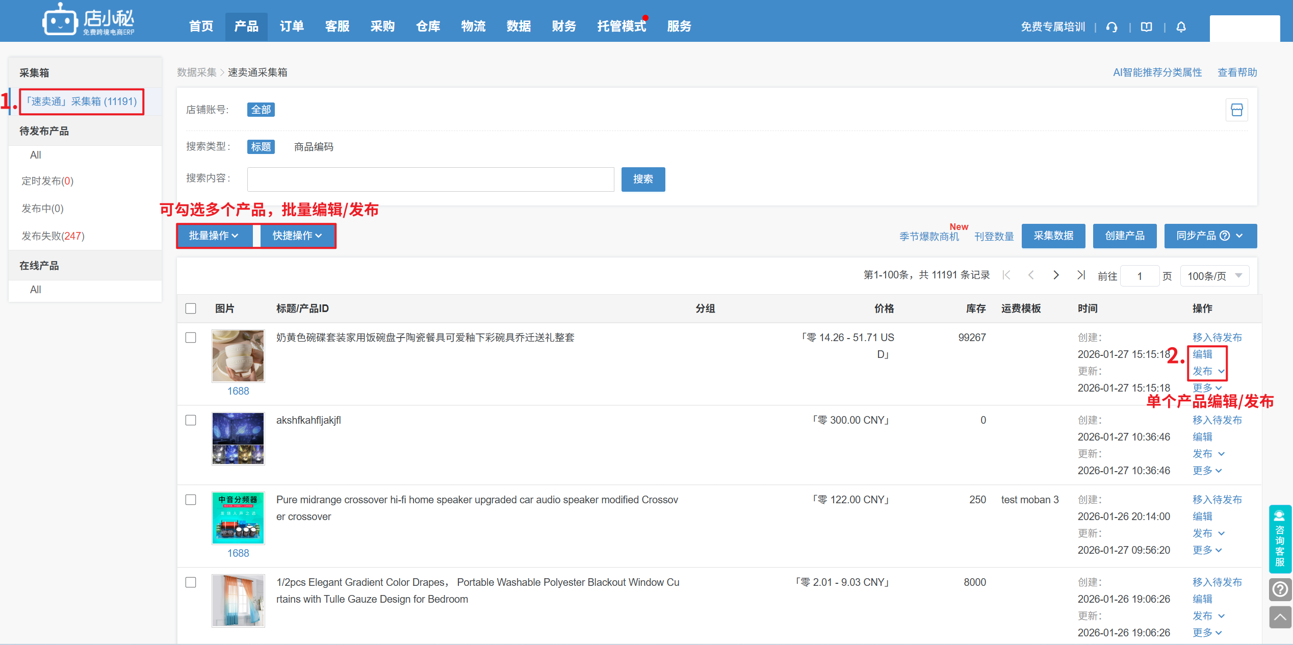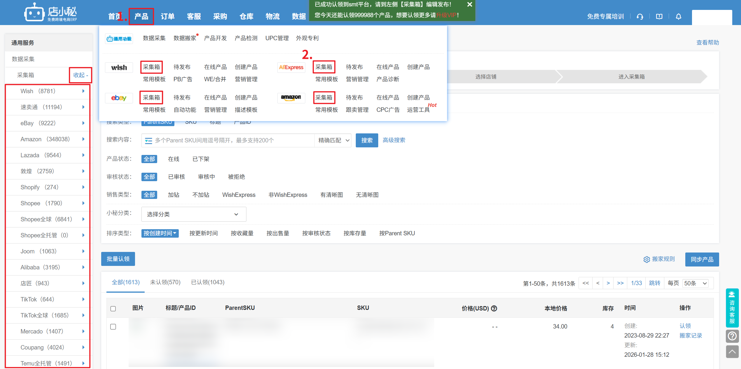 第二步:【提示认领成功后—点击进入左侧平台采集箱/导航栏产品下的平台采集箱—单个/批量编辑—发布即可】