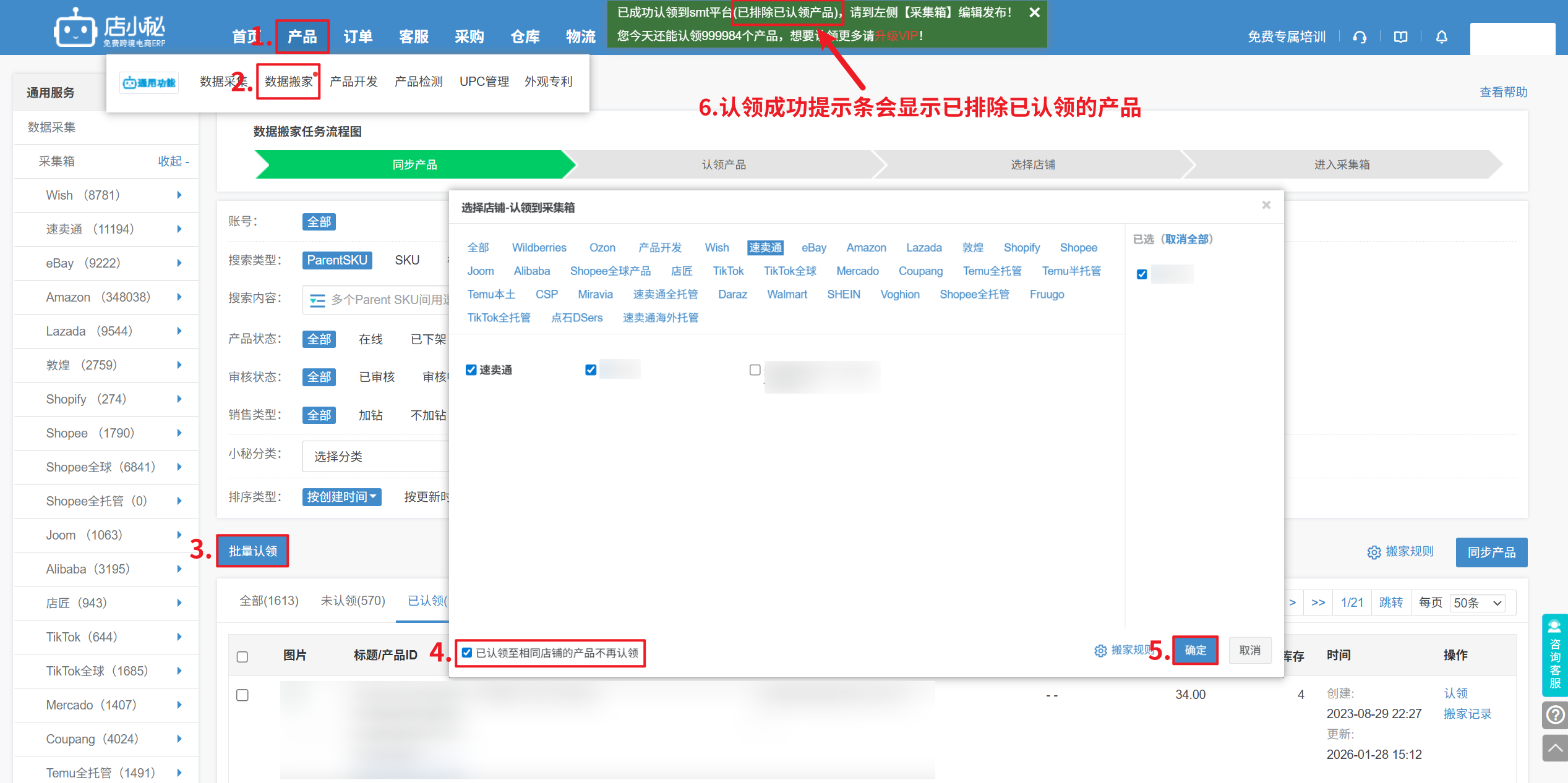 第一步:【产品—数据搬家—选择要搬家的平台—同步产品—单个/批量认领—选择平台、店铺账号—确定】