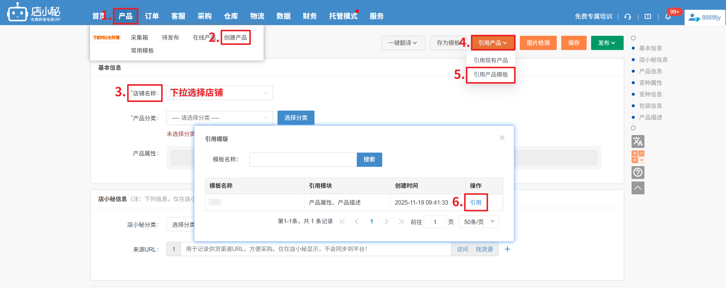 第三步:【产品—创建产品—选择店铺—单个/批量引用产品模板—选择具体模板,点击引用即可】1、单个产品引用: