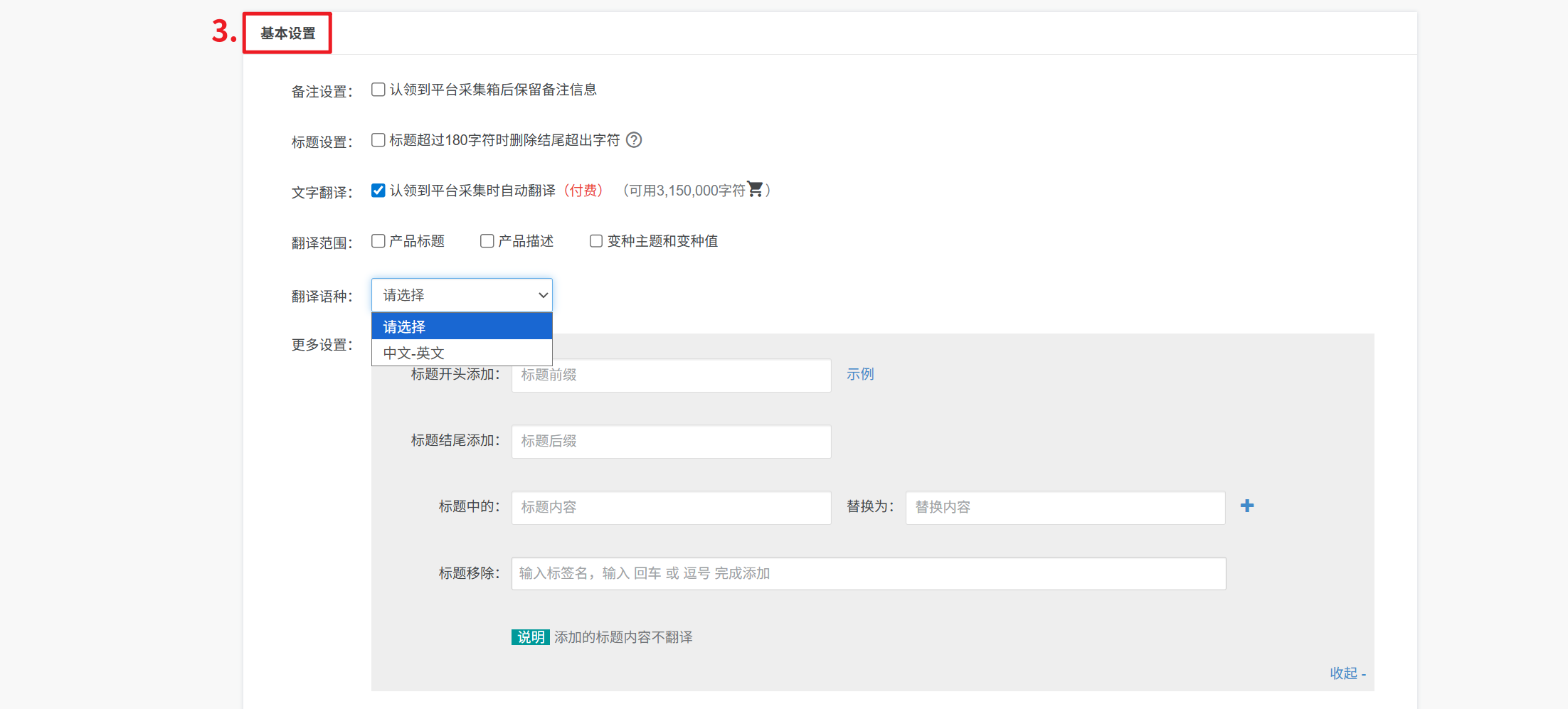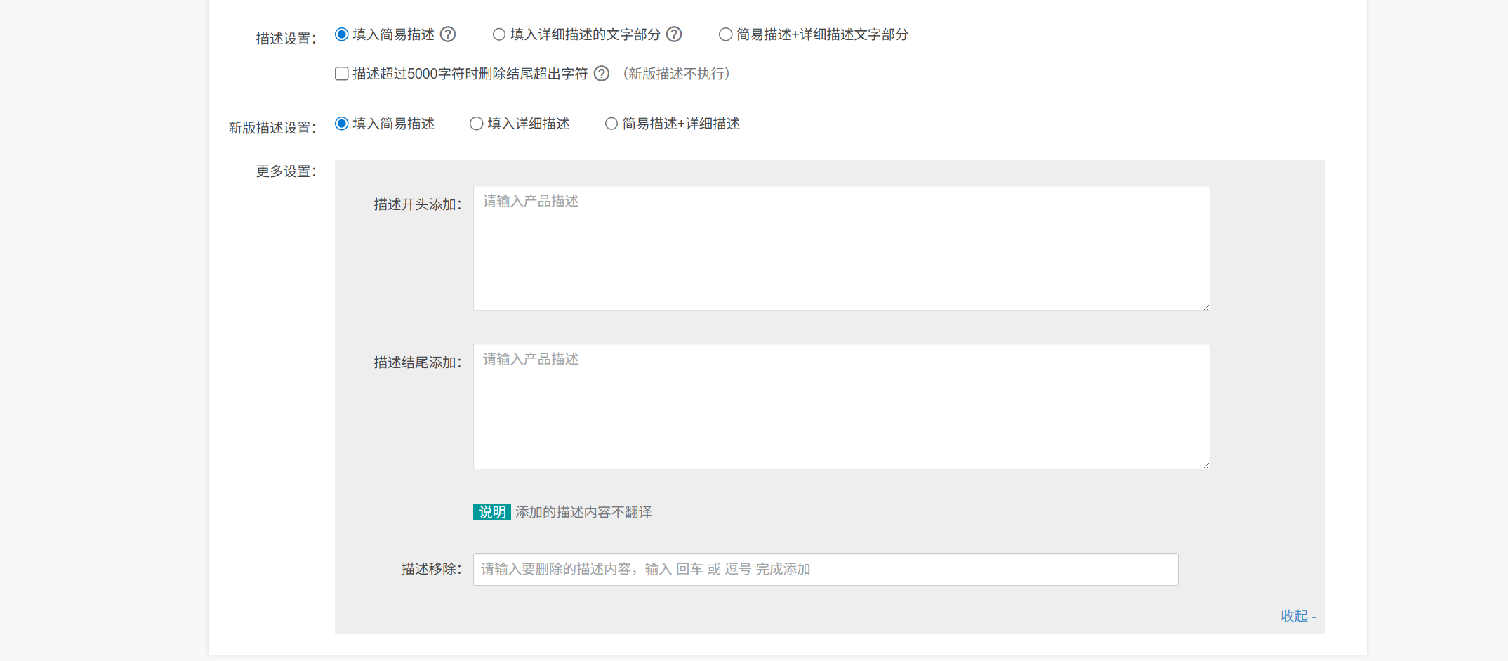 更多设置:对描述内容开头或者结尾添加固定内容或者删除描述中具体词汇,添加的描述内容不翻译