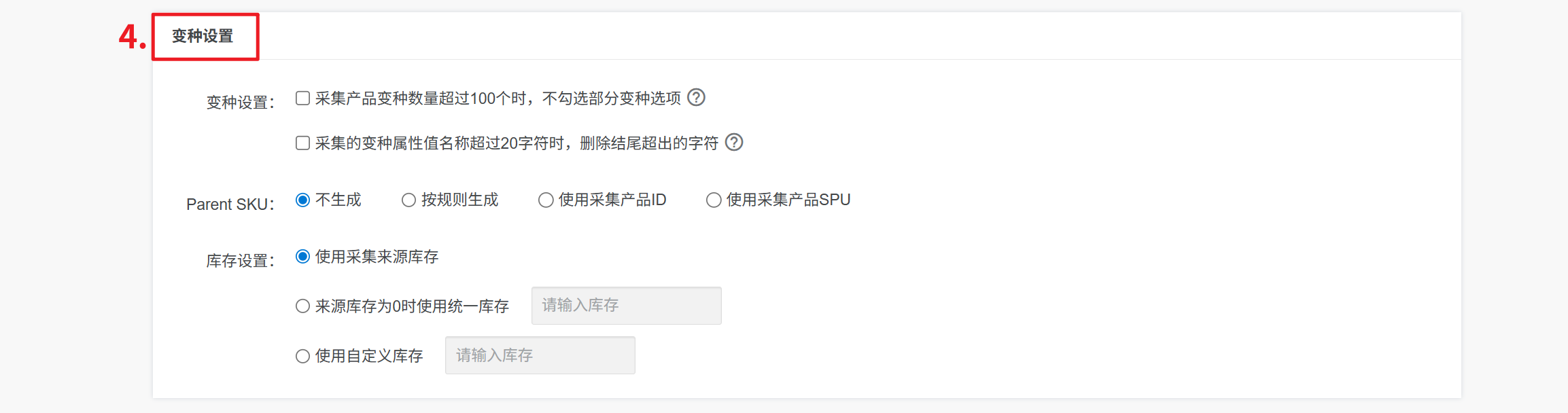 ③ 不管采集时是否有库存,默认使用自定义库存