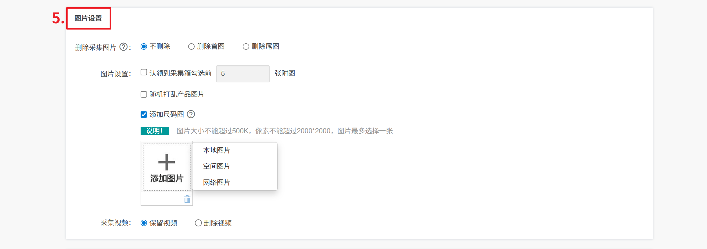 5、图片设置:对采集来的图片可删除或只需要勾选前几张图片认领到店铺、打乱图片顺序、添加尺码图