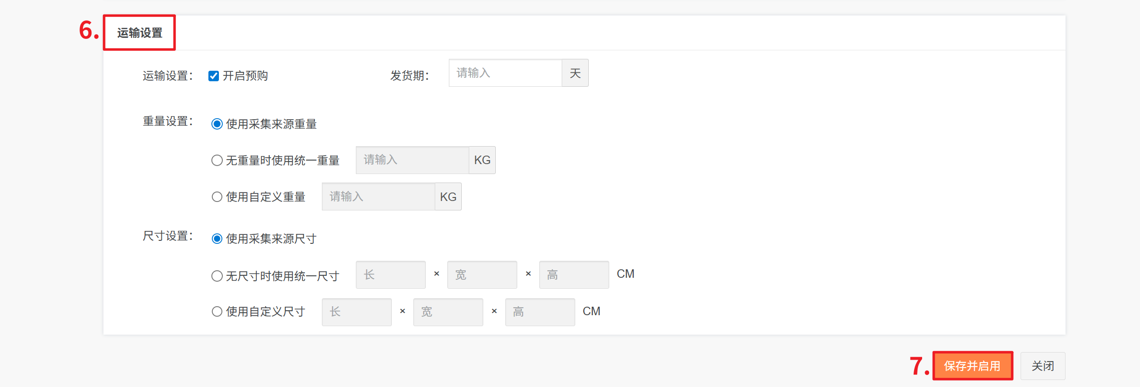 6、运输设置: