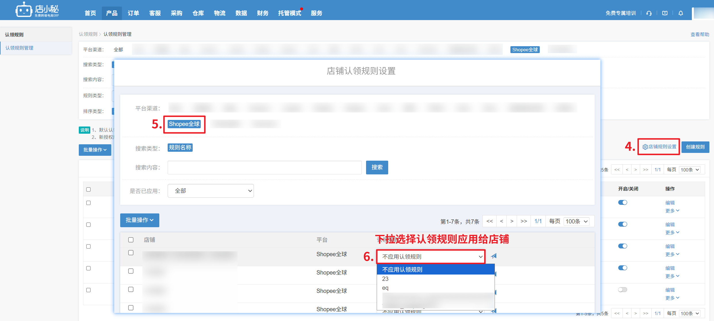 【产品—数据采集—认领规则—管理认领规则—店铺规则设置—下拉选择认领规则应用给具体店铺】