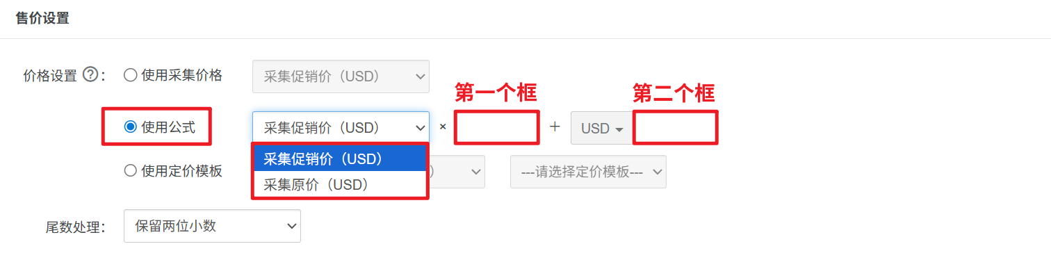 ② 使用公式:指先将采集原产品的价格(USD)/促销价(USD),进行(翻倍)调整,最后再(增加/减少)多少钱