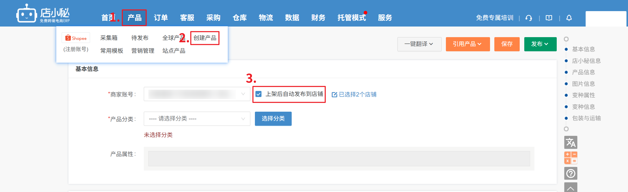 第一步:【产品—全球产品—采集箱/待发布/创建产品—勾选上架后自动发布到店铺—选择具体站点】