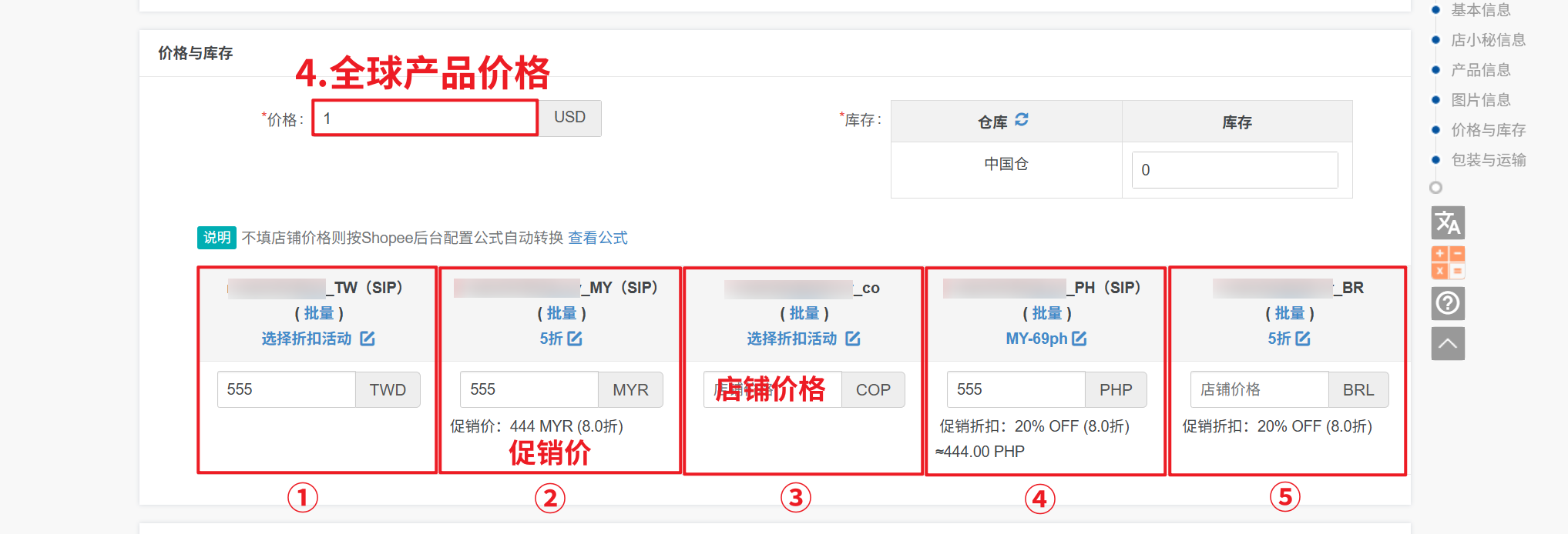 第二步:【填写全球产品价格—填写店铺价格(对应站点币种)—可选择折扣活动,设置折扣价/折扣比例】