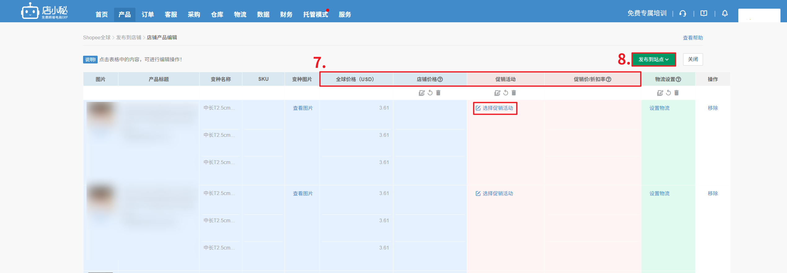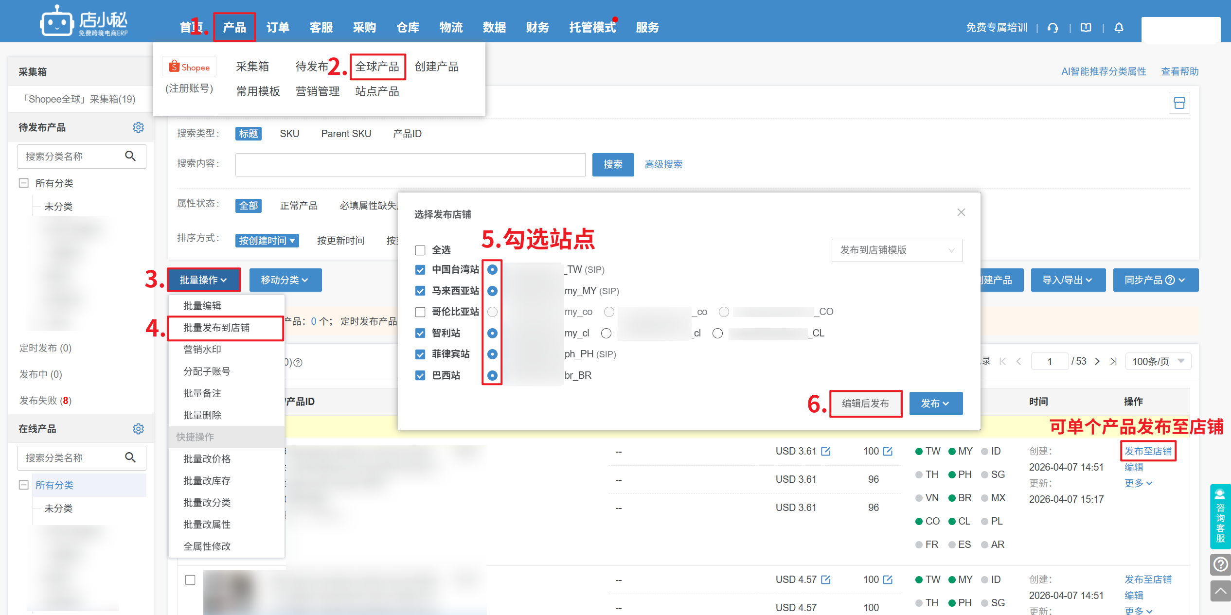 第一步:【产品—全球产品—在线产品—单个/批量—发布至店铺—选择具体站点—编辑后发布】