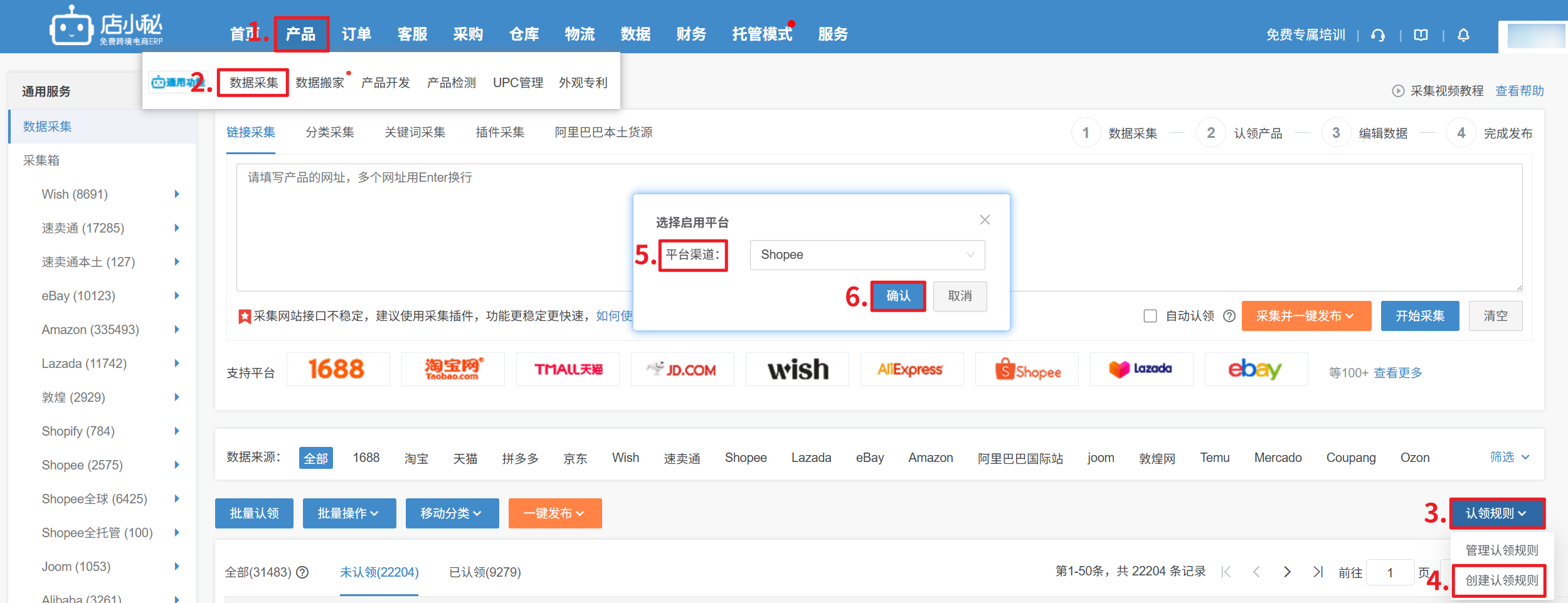 第一步:【产品—数据采集—认领规则—创建认领规则—选择Shopee—确定】