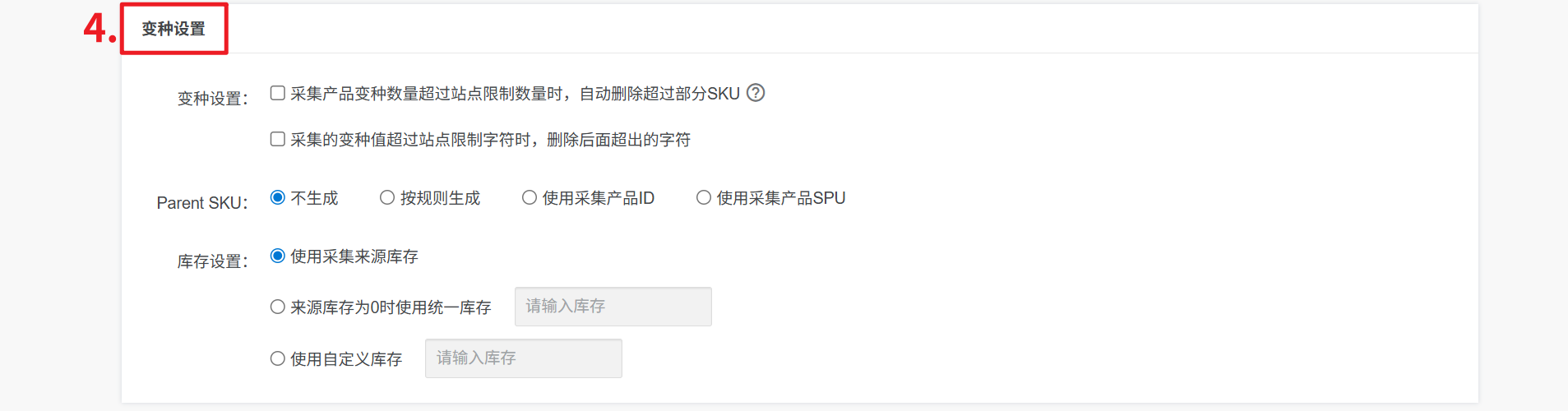④ 按采集产品SPU作为前缀生成:按【产品SPU+变种属性名称】生成SKU