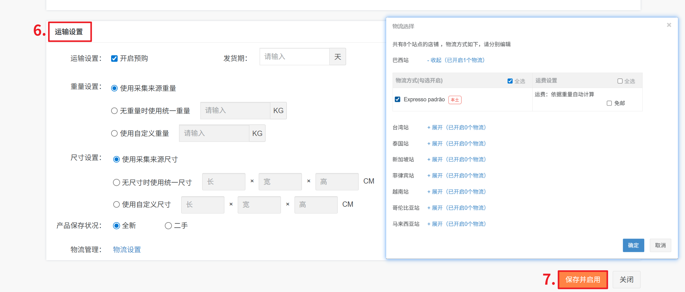 注意:弹窗内勾选物流为该站点下所有店铺开启物流之和,勾选后发布到具体店铺,根据店铺后台启用物流生效