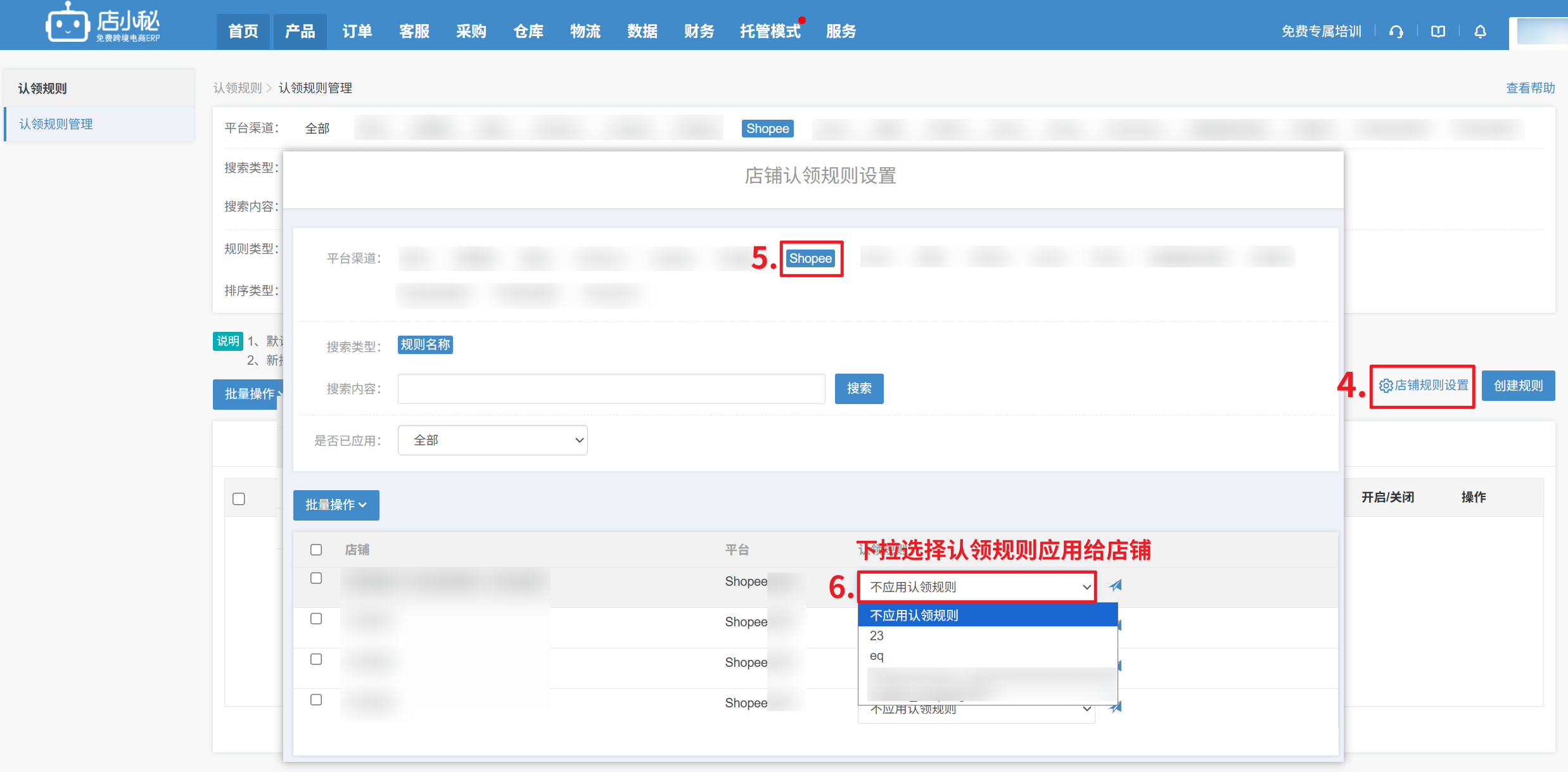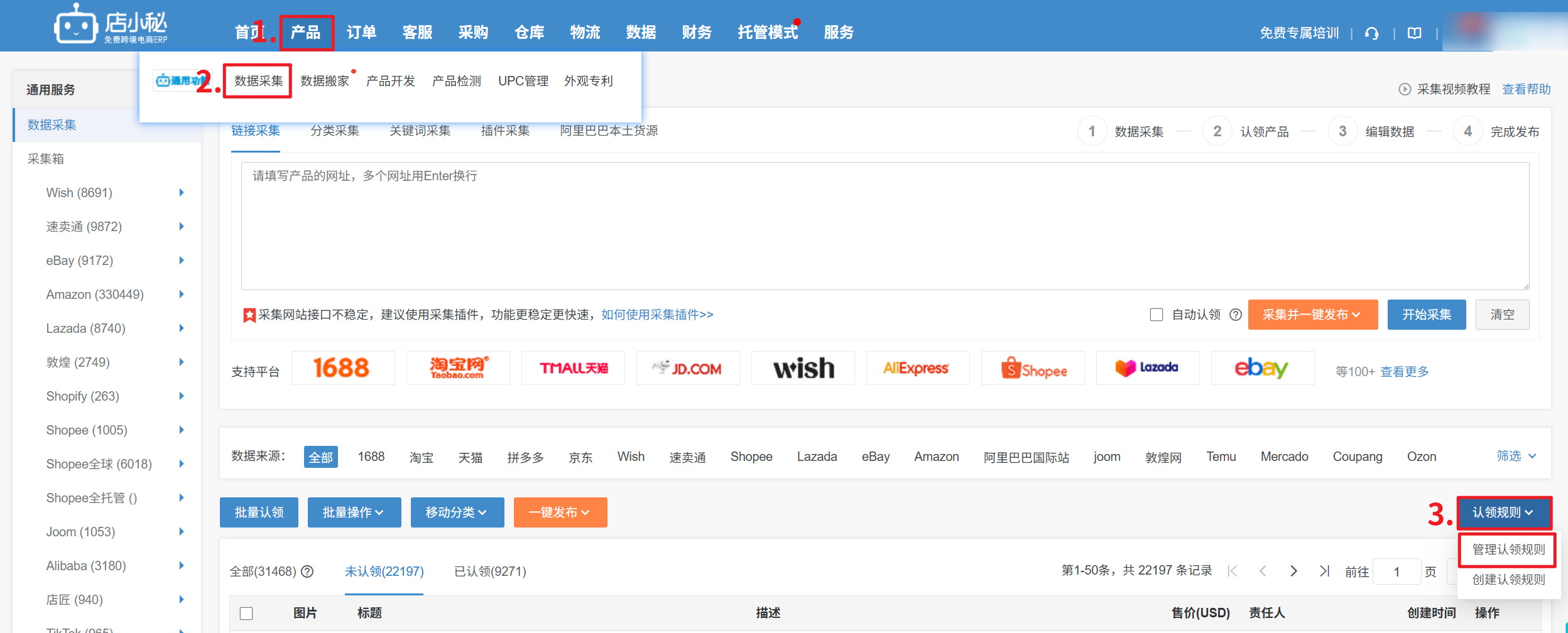 【产品—数据采集—认领规则—管理认领规则—店铺规则设置—下拉选择认领规则应用给具体店铺】