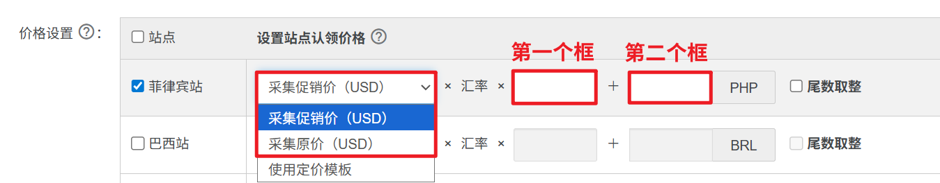 公式:指先将采集原产品的价格(USD)/促销价(USD),按汇率转化为对应站点币种价格后,